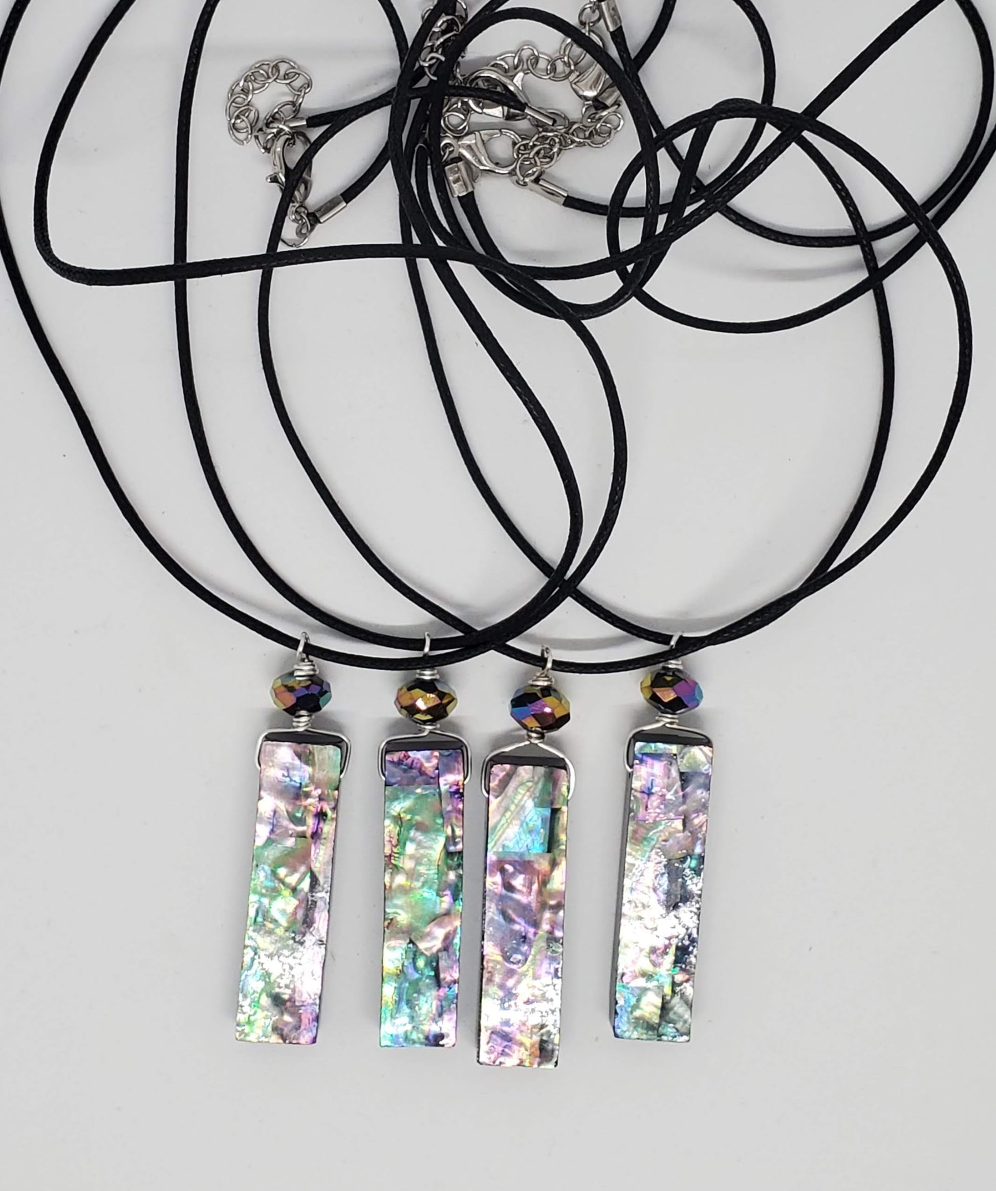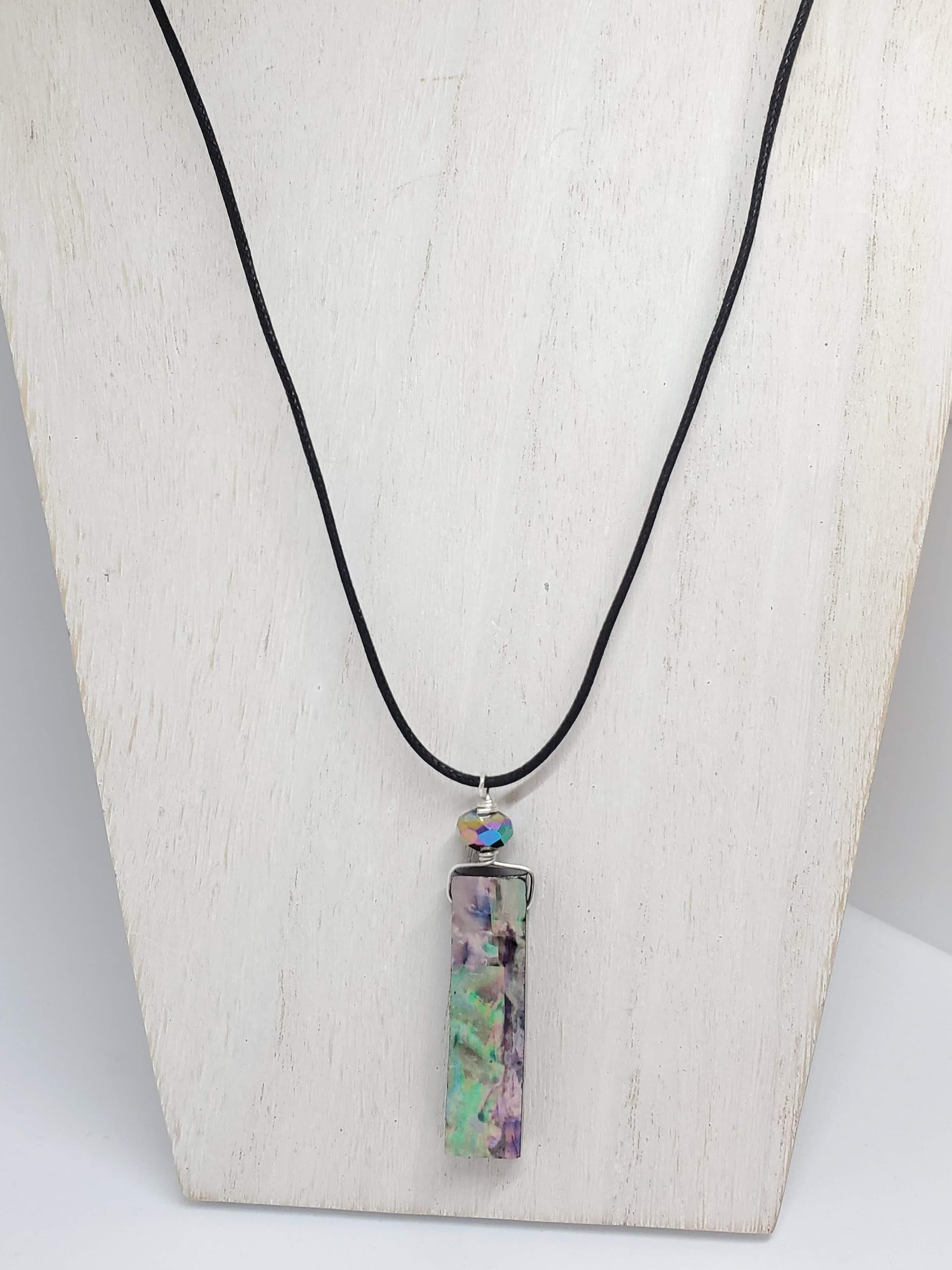 A gorgeous necklace that can be dressed up or down, depending on your mood. Abalone inspired pendant is accented with a faceted iridescent bead and hangs approximately 2.25” from cord. Sturdy black cotton cord measures approximately 24” with 2” extender. Coordinates with black iridescent Aurora earrings.