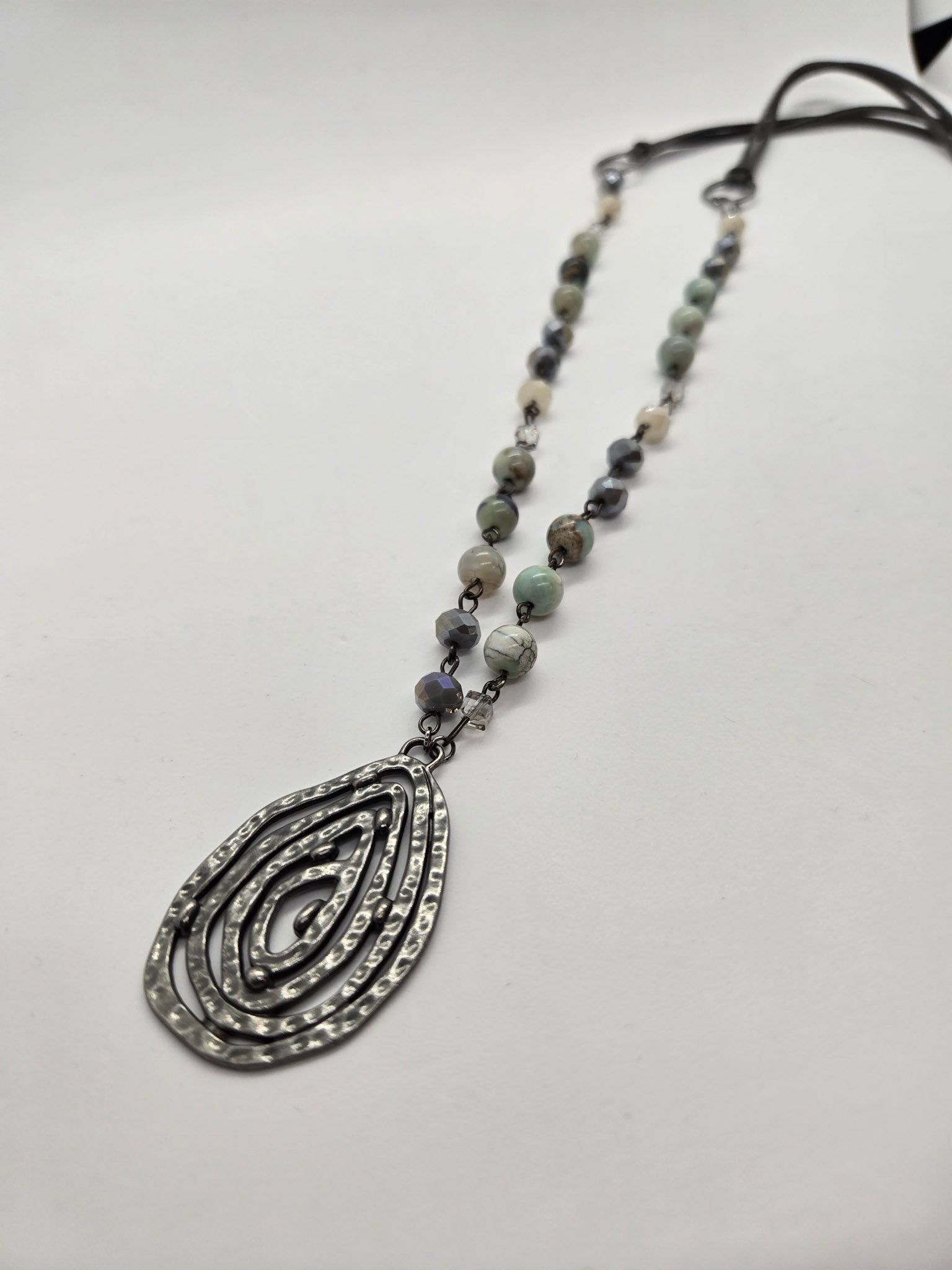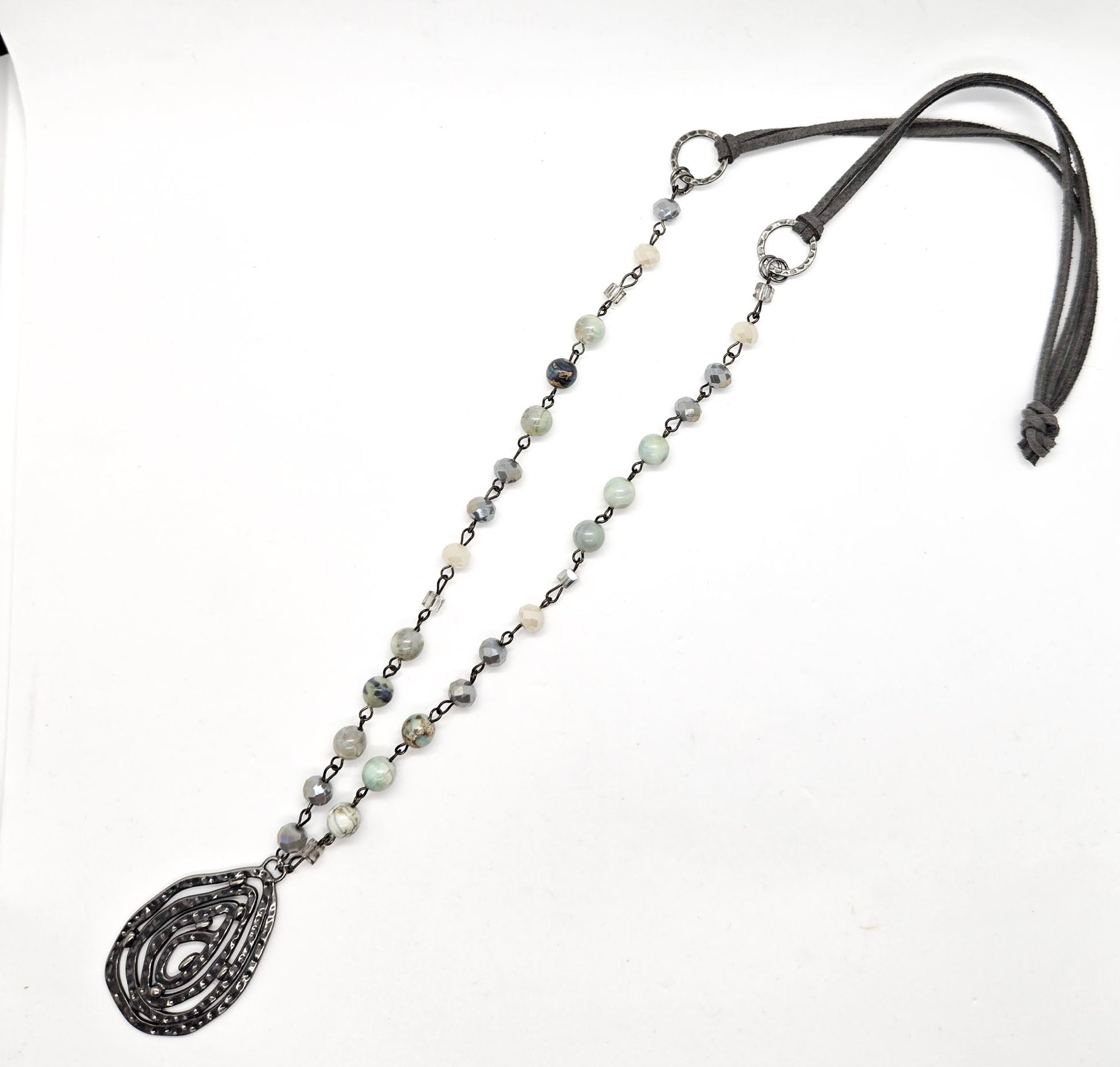 The look is grounded with gunmetal-plated connectors and a textured gunmetal teardrop pendant, adding just the right touch of bold contrast. A smooth gray microsuede cord keeps the piece lightweight, comfortable, and effortlessly wearable.
