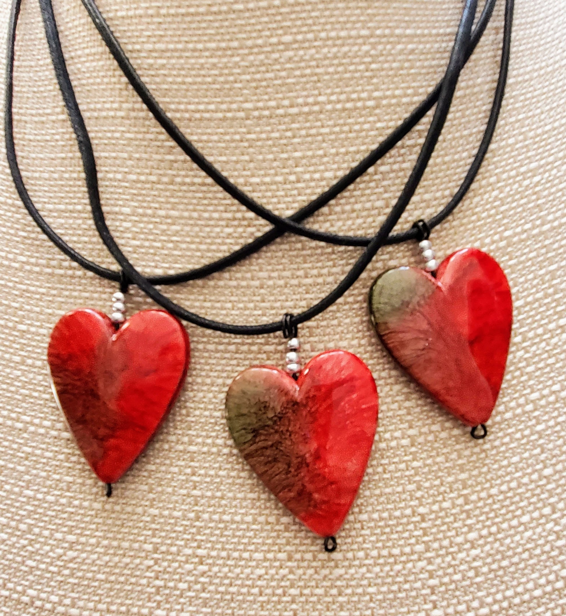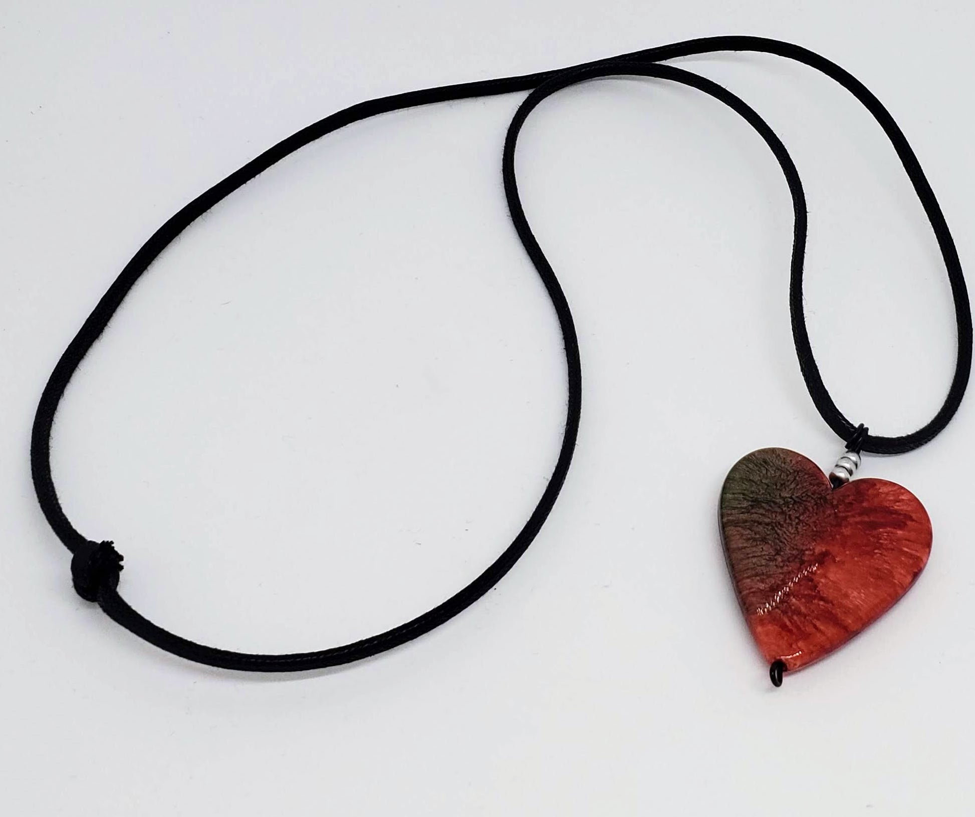 Fun necklace makes a “love”ly impact. Large lightweight heart pendant measures approximately 2.5” and has a gemstone look with varying shades of red and bits gray/brown. Sturdy cotton cord with a simple knot closure measures approximately 30”.