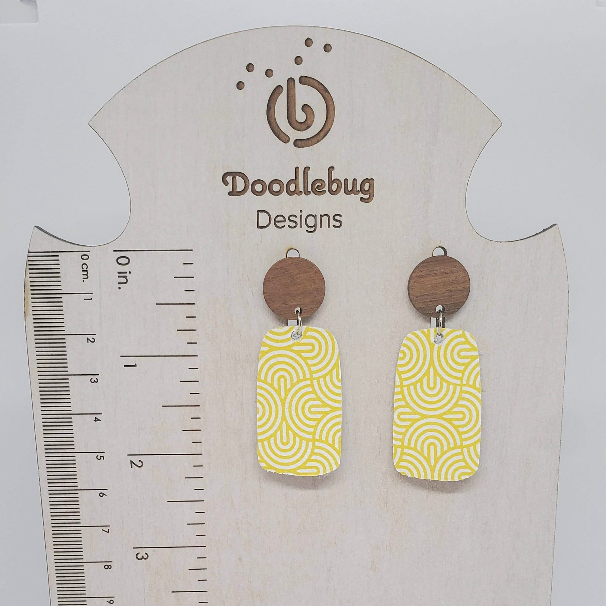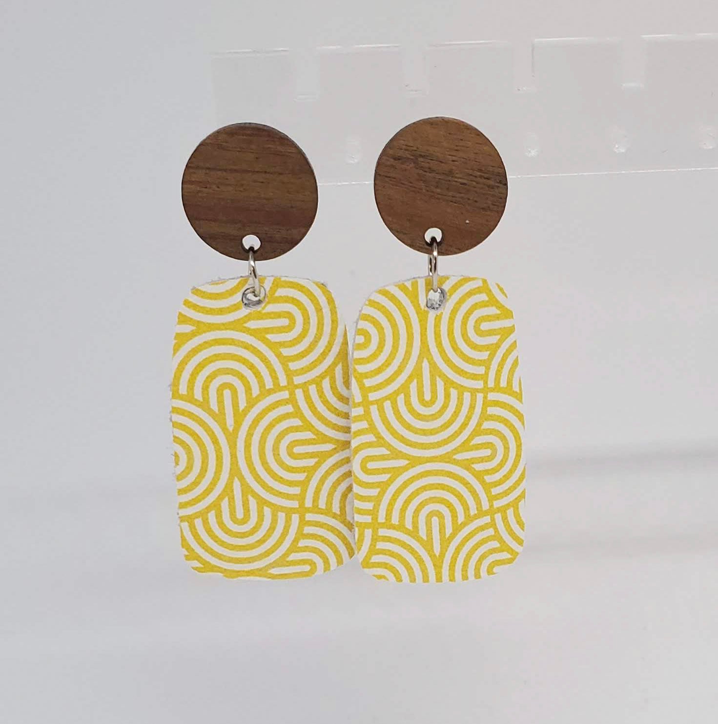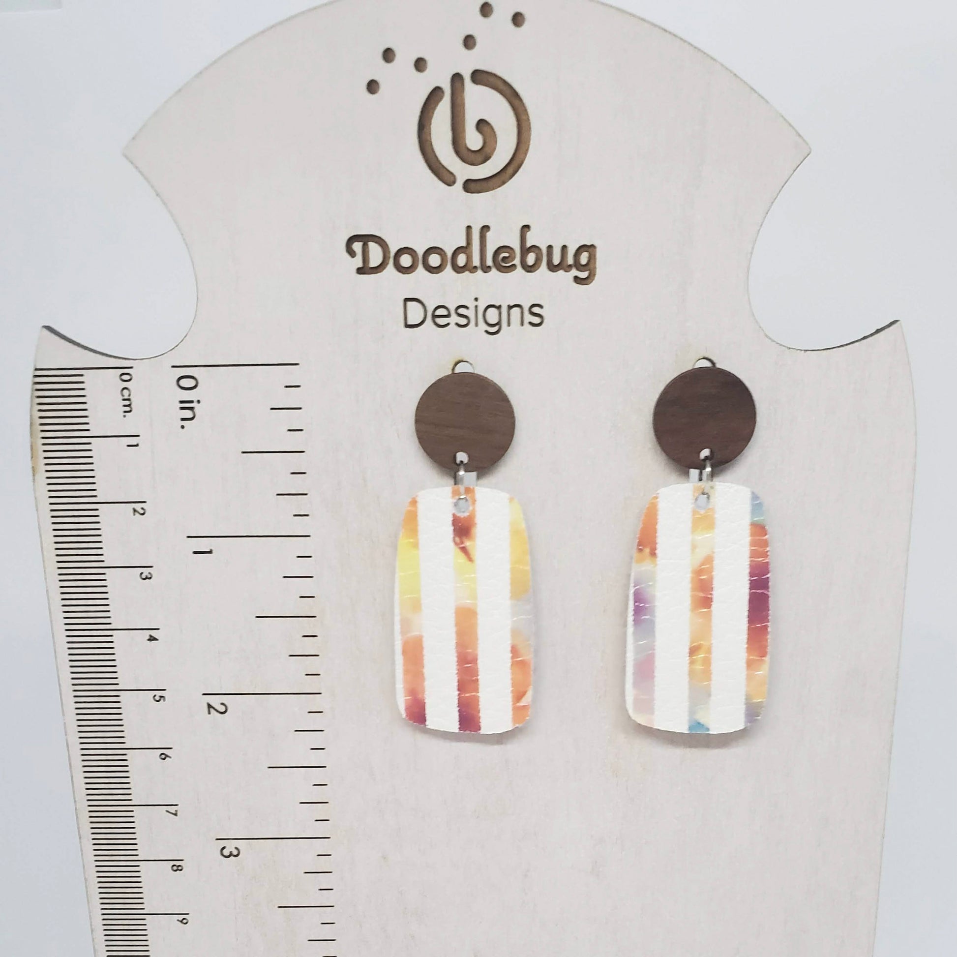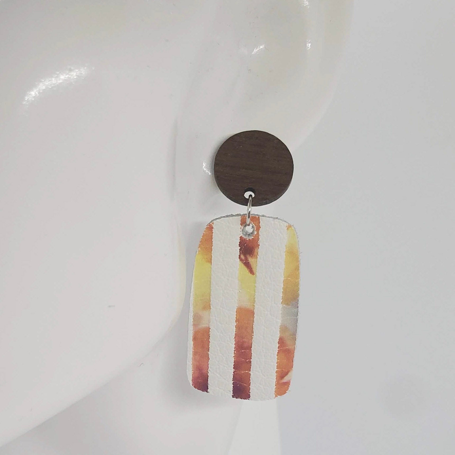 Stunning earrings combine the beauty of wood and leather for an on trend look. Genuine wood with stainless steel posts. Rounded rectangle leather measures approximately 1.5” from bottom of post.