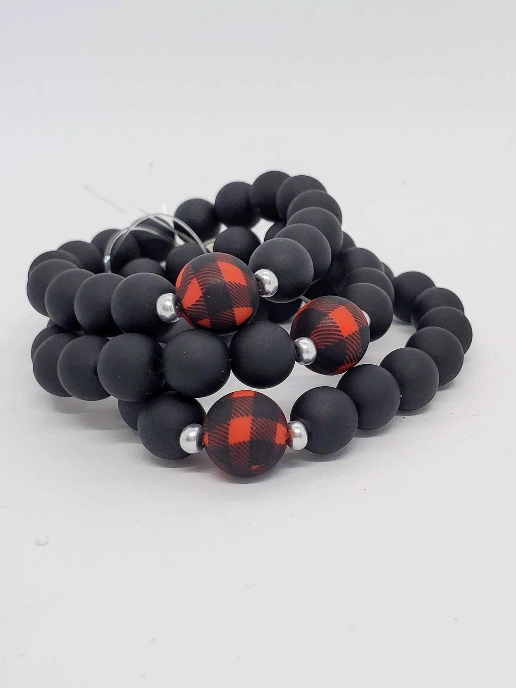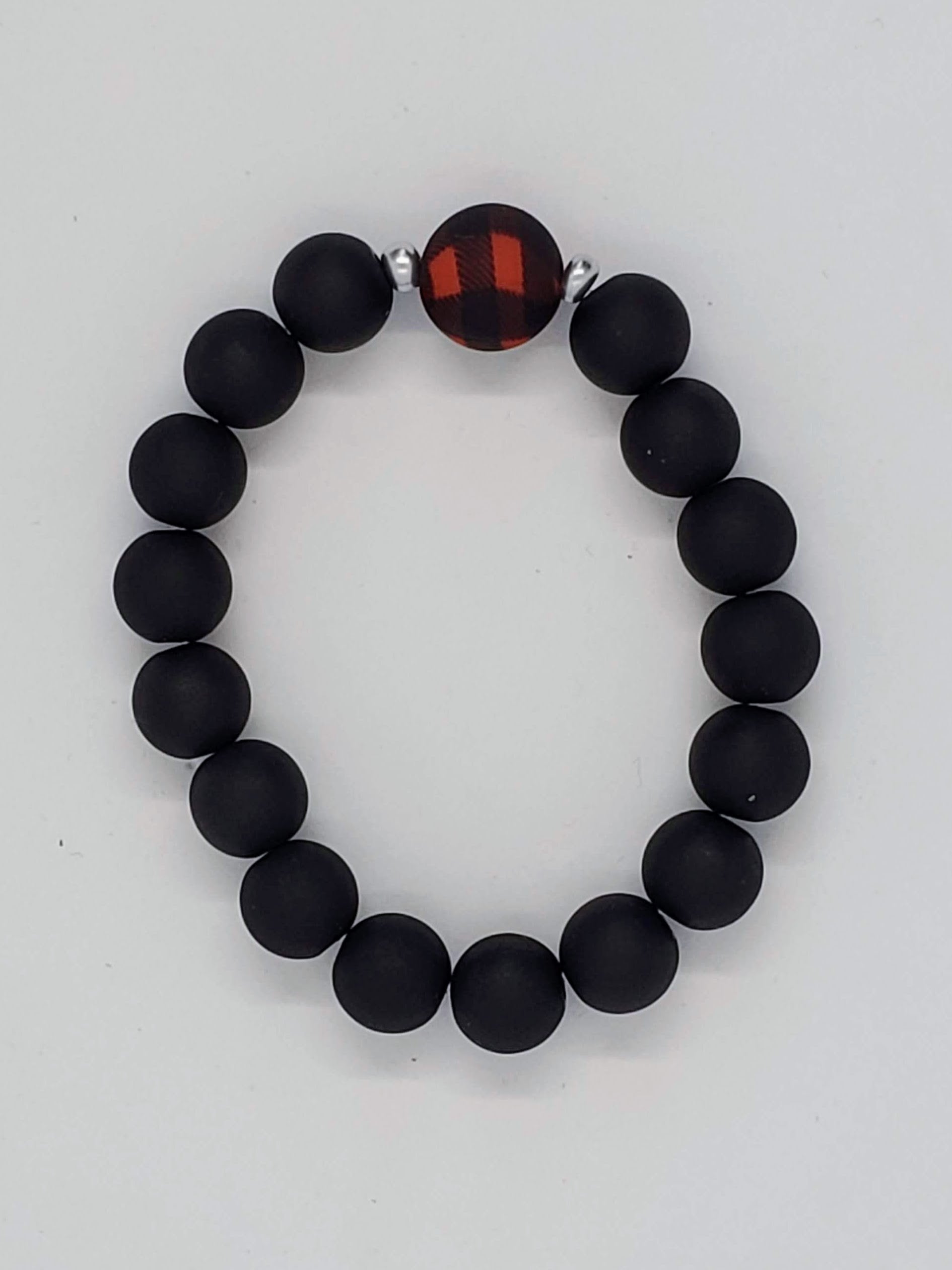 A holiday/winter classic, red and black buffalo plaid, are the focal of this fun stretch bracelet. Matte black beads (10mm) and matte silver spacers set off a 12 mm matte plaid bead.