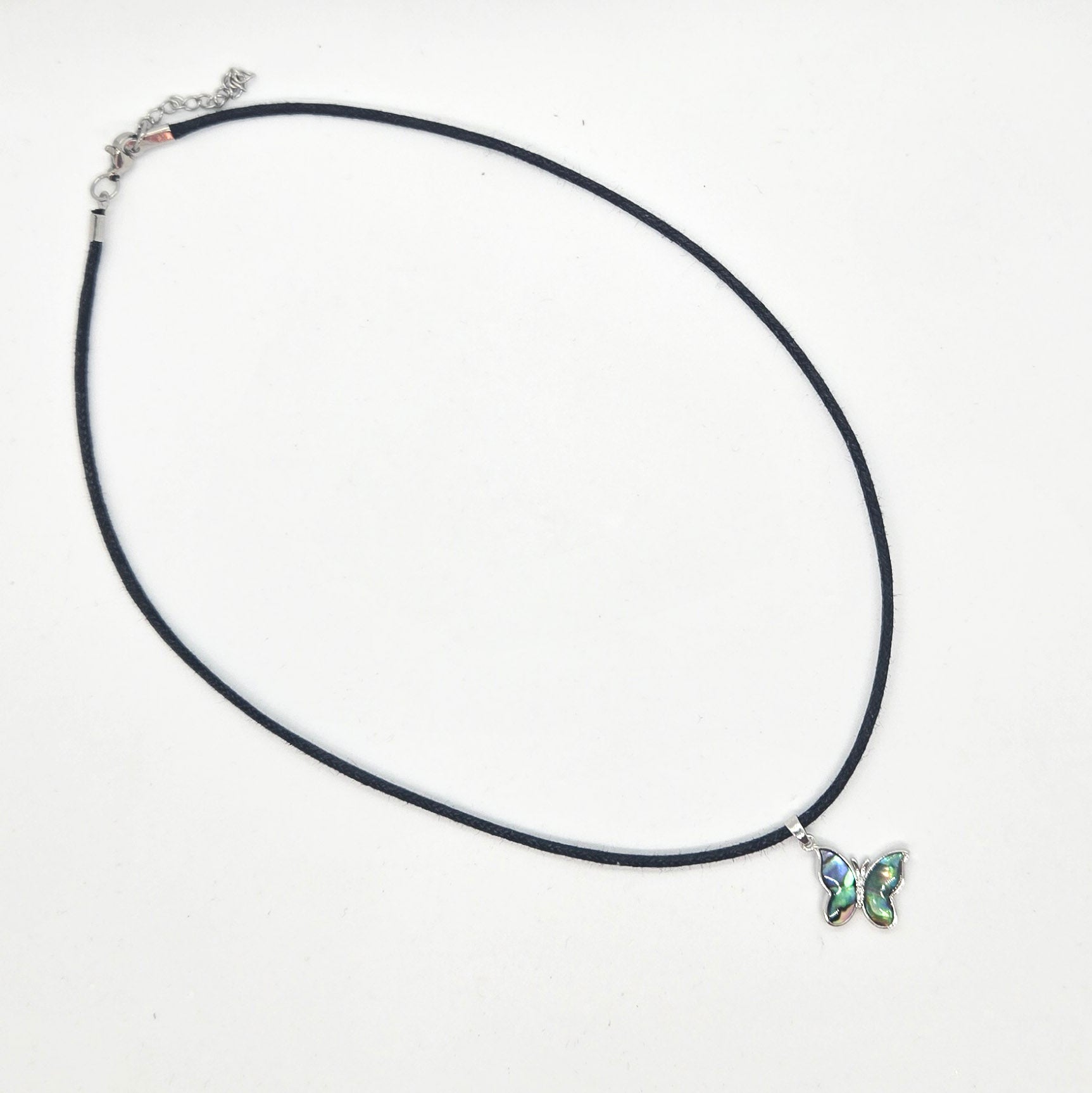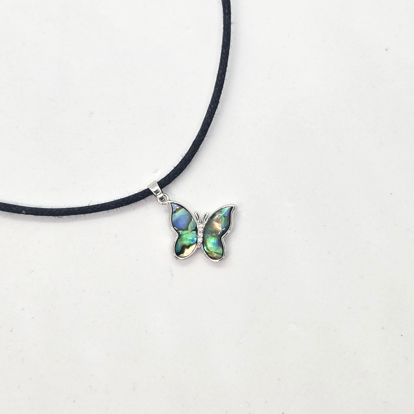 This lovely is a reminder that change can be beautiful. Features a platinum plated paua shell charm with cubic zirconia that hangs from an 18" sturdy cotton cord. 2" extender for added versatility.