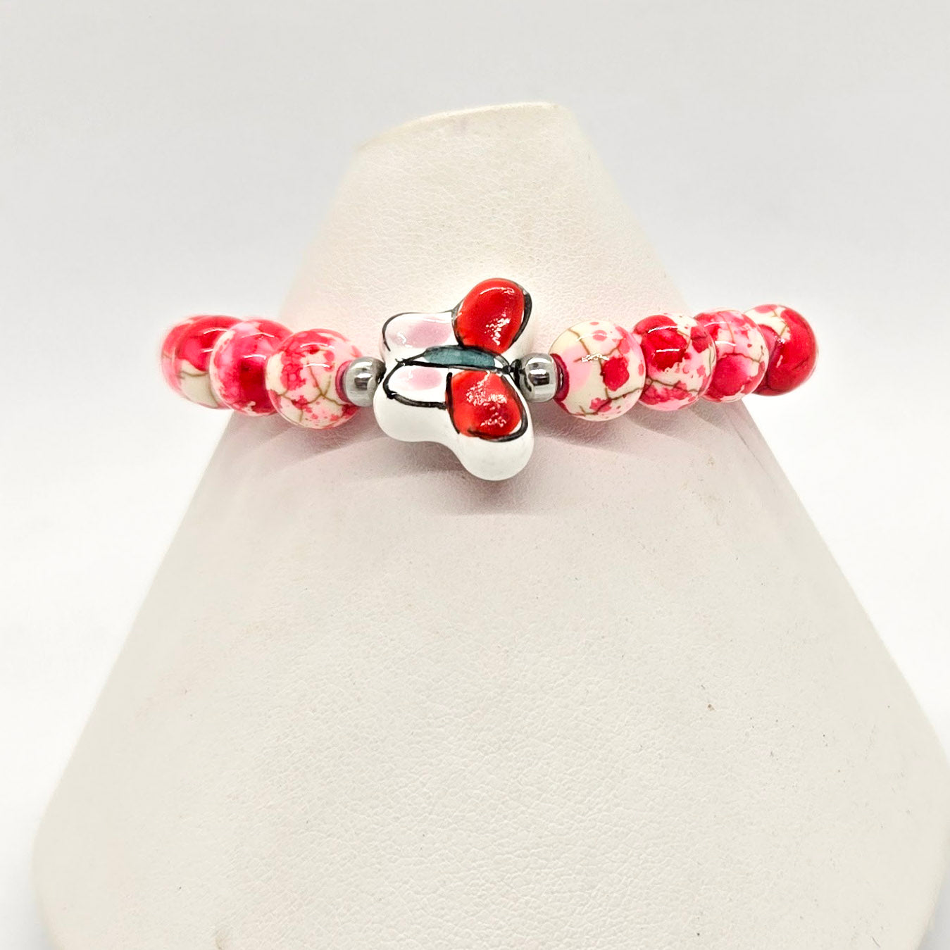You'll wear these stretch bracelets as a reminder that change can be beautiful. Colorful 8 mm (.3") beads are accented with stainless steel beads and/or spacers and a silver plated charm or porcelain bead.