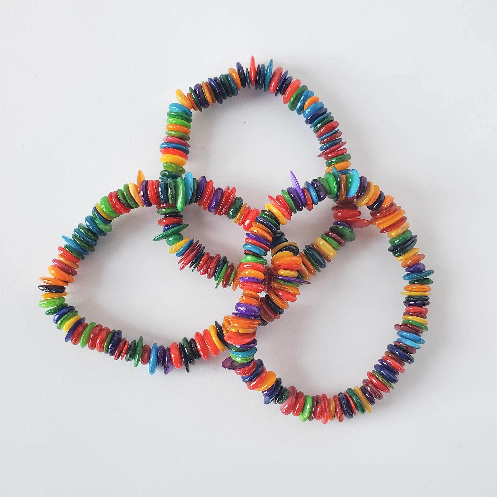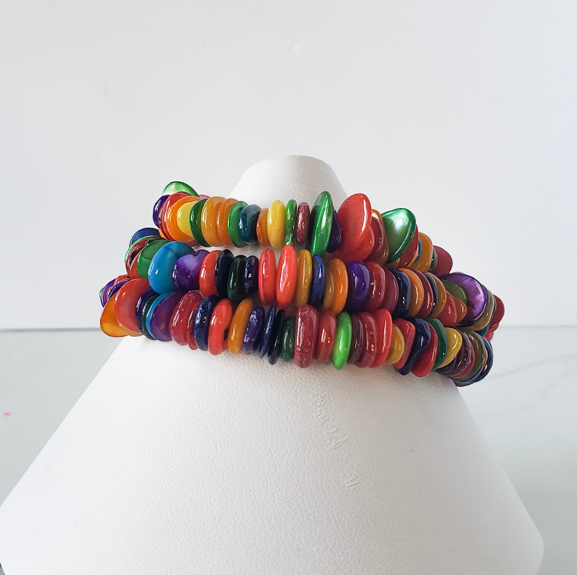 Multicolored shell beads will add a fun pop to any stack or make a statement on their own. Beads will vary between 5-10 mm.