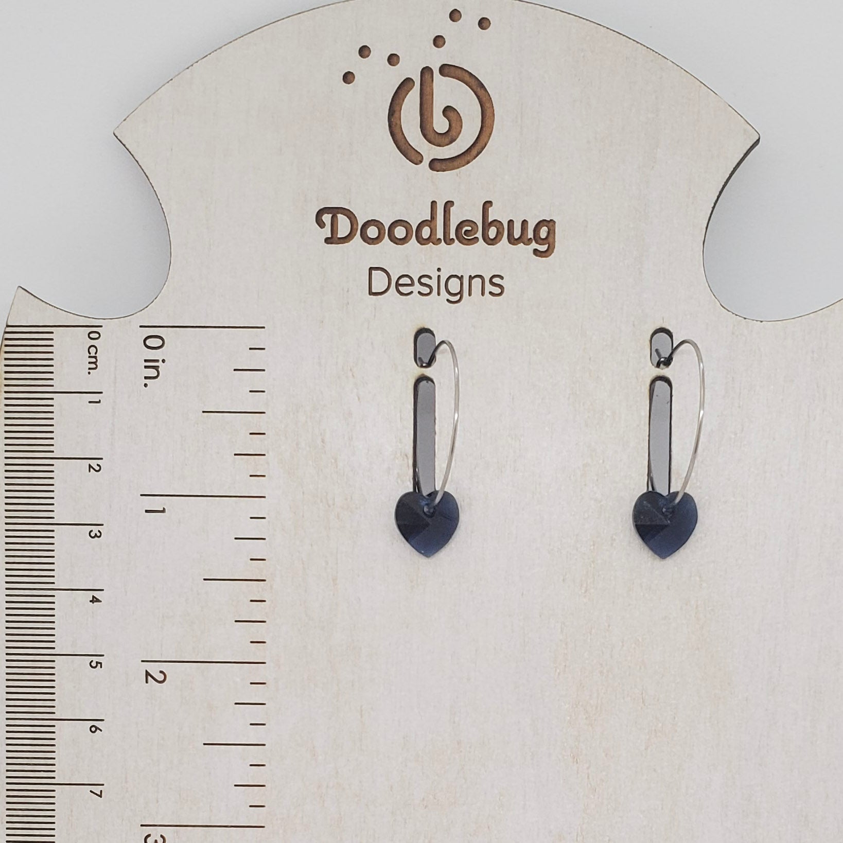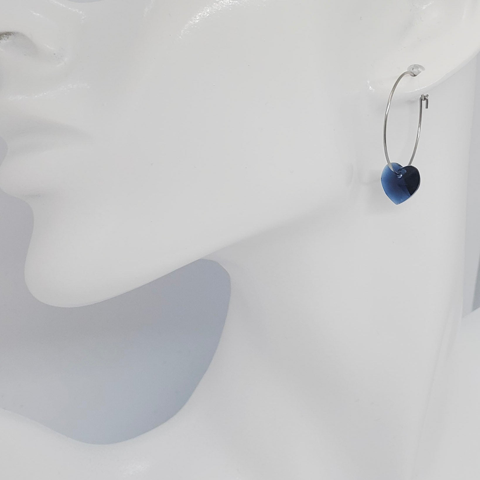 Beautiful earrings made with superior quality Swarovski crystals in navy or blush pink. Navy crystals are 3/8” and are suspended from non-tarnish, non-wear stainless steel 1” hoops. Pink heart is .75” and hangs from non-tarnish and non-wearing stainless steel ear wires.
