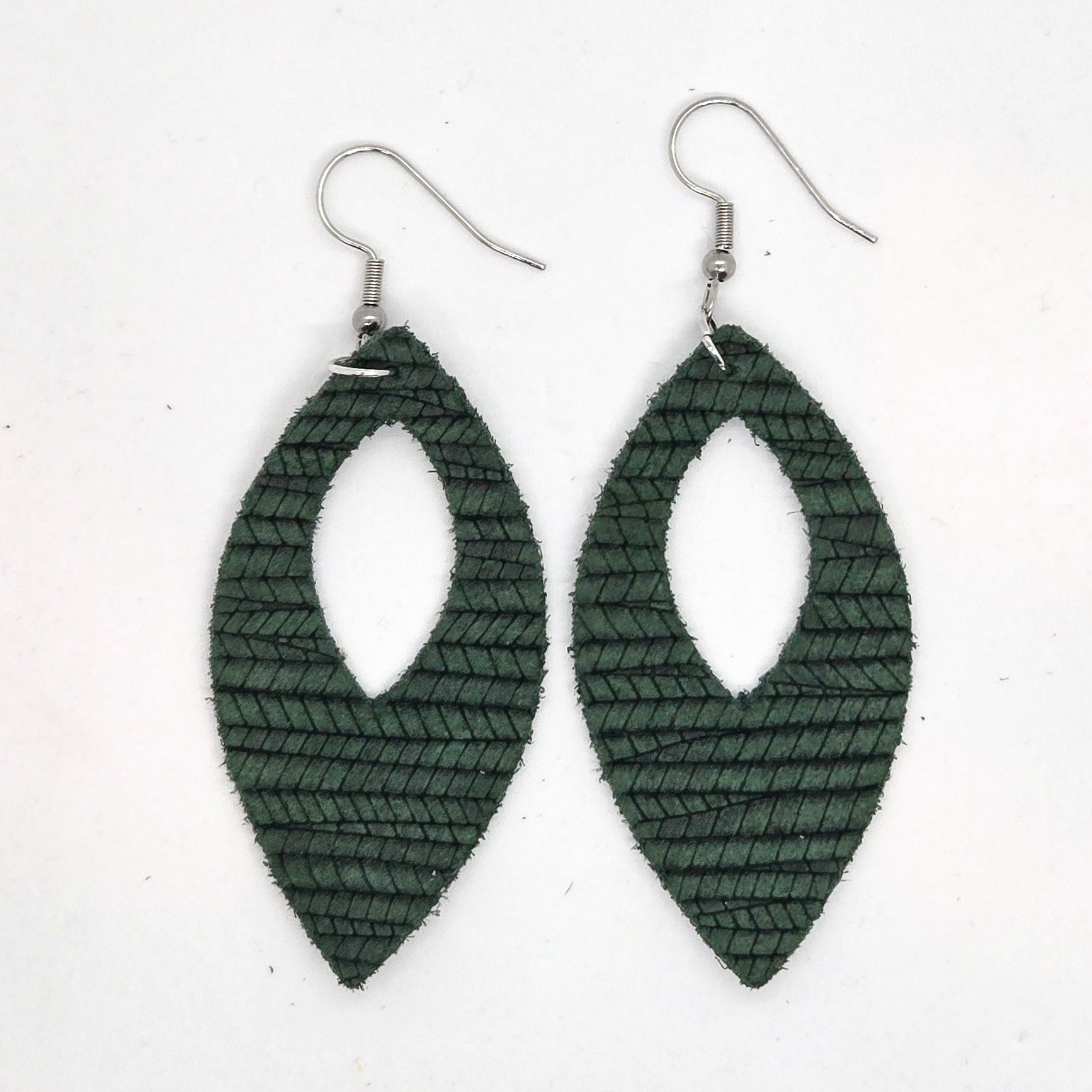 These gorgeous leather earrings will be worn on repeat. Made with lightweight genuine leather or leather backed cork, these beauties are finished with stainless steel ear wires. Measures approximately 2.25" from bottom of ear wires.