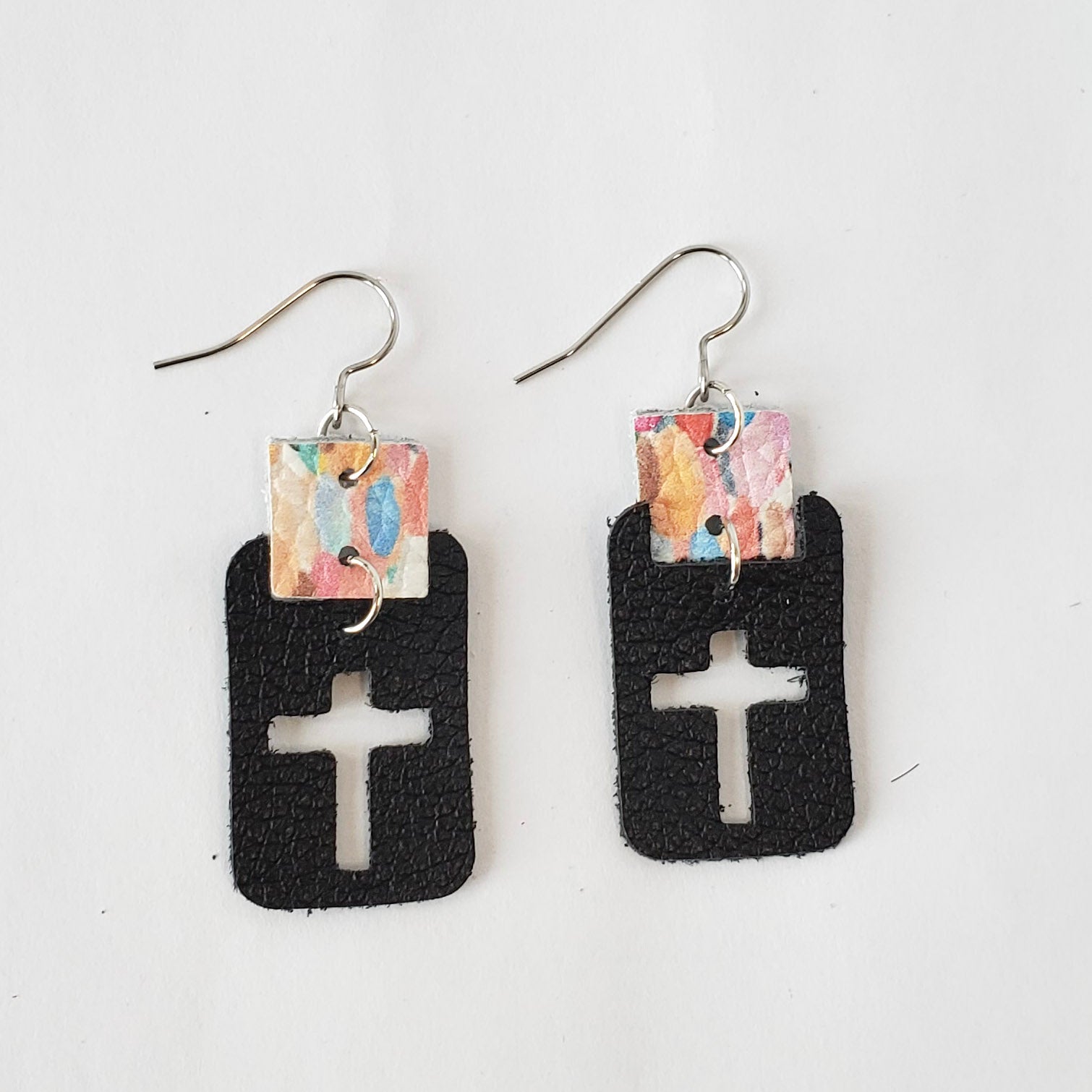 Lightweight 2 piece leather earrings will make a stunning accent to your outfit. Available in 4 color/pattern combinations and finished with non-tarnish stainless steel ear wires. Measures approximately 1.5” from bottom of ear wire.