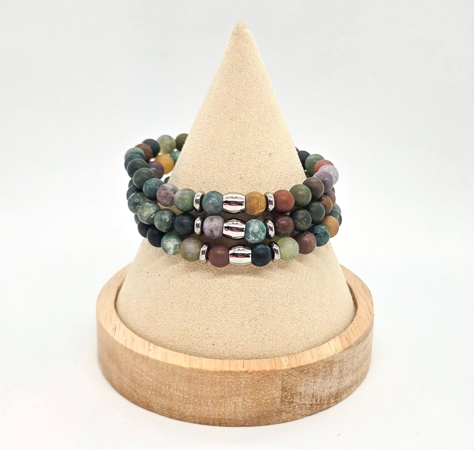 Rich colors make this bracelet an easy choice. Fancy jasper gemstones are strung on strong stretch cord and highlighted with non-tarnish stainless steel beads.