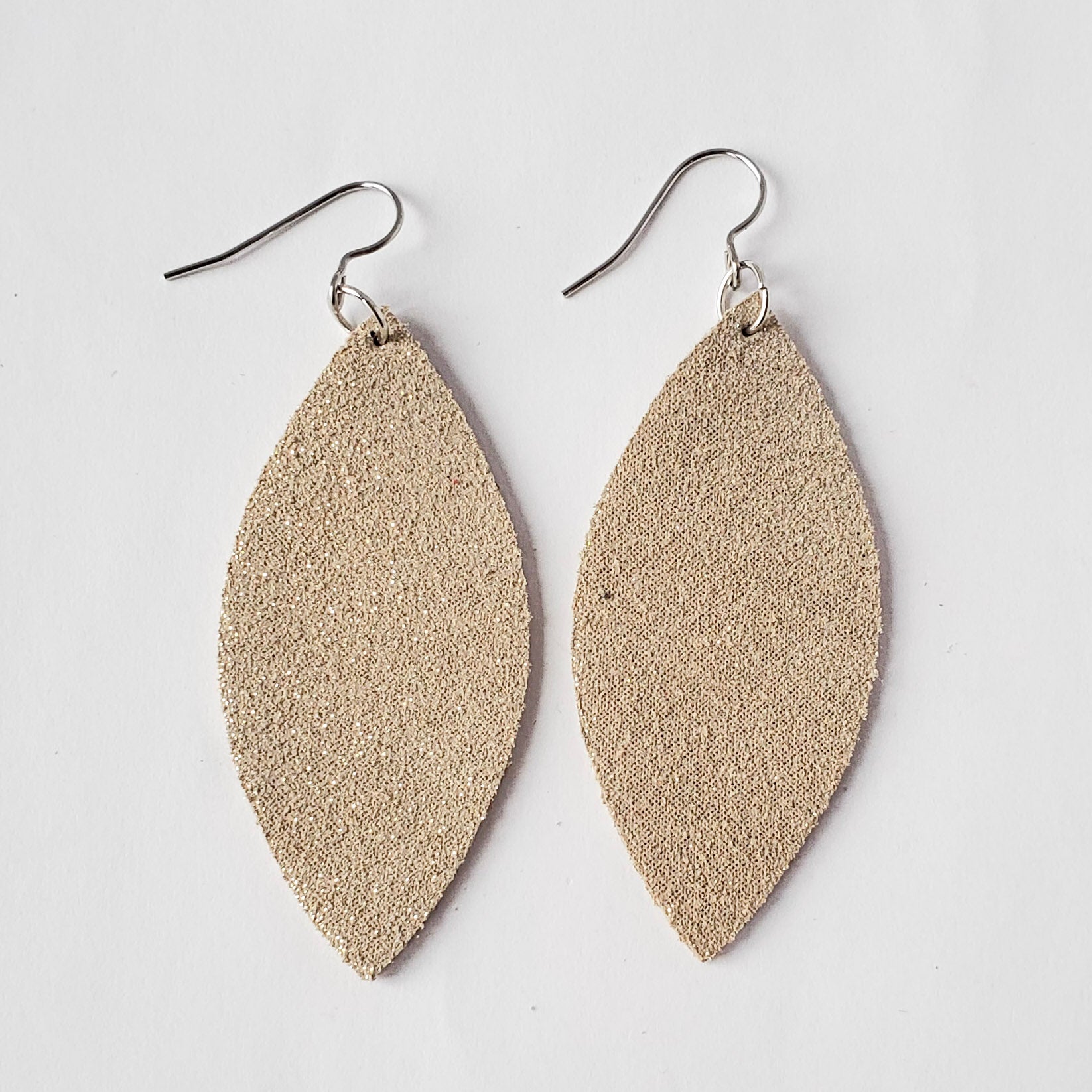 Lightweight leather earrings in the popular petal shape. Petal measures 2.25” from bottom of stainless steel ear wire.