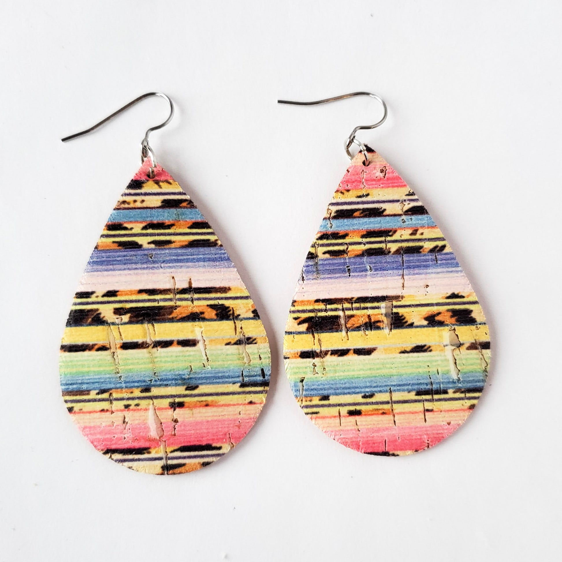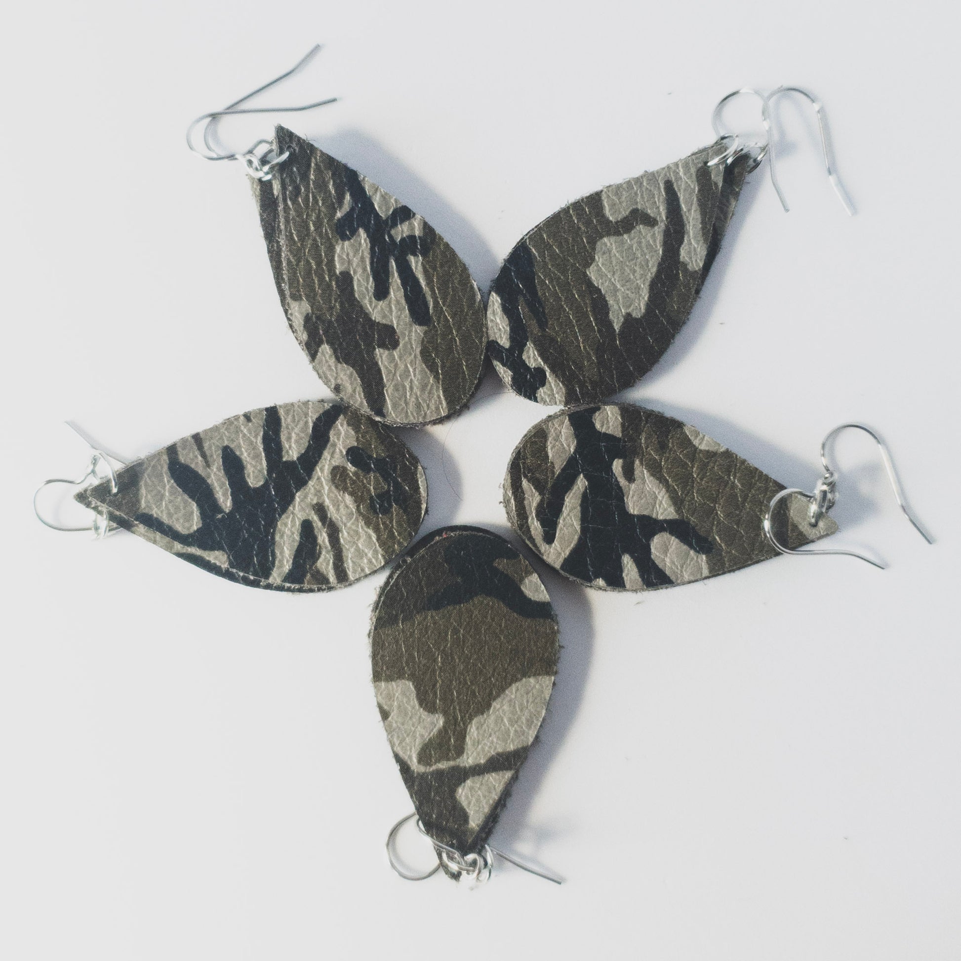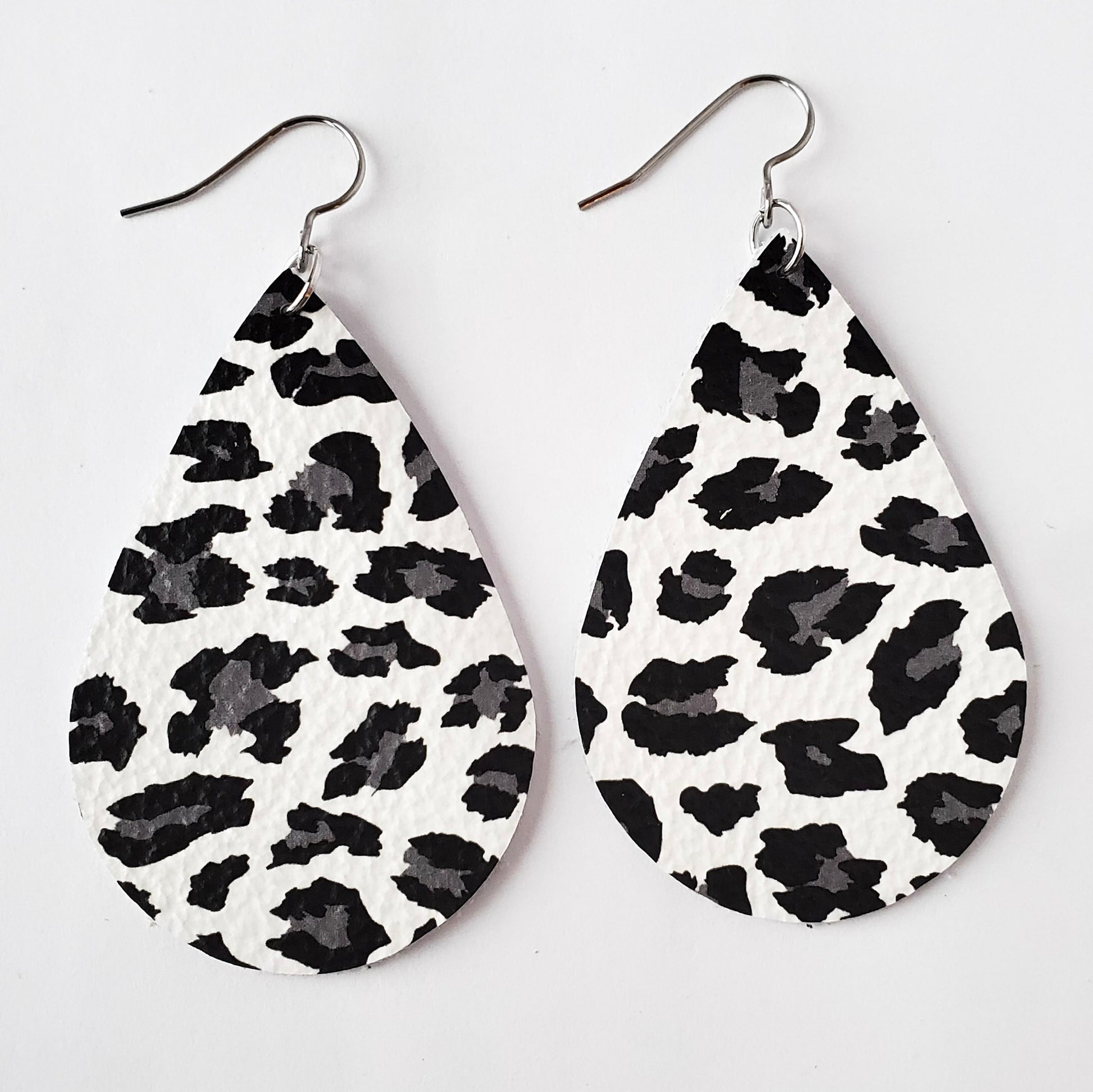 Lightweight earrings in leather or vegan/faux leather prints measure approximately 2.25” from bottom of ear wire. Made with stainless steel ear wires.