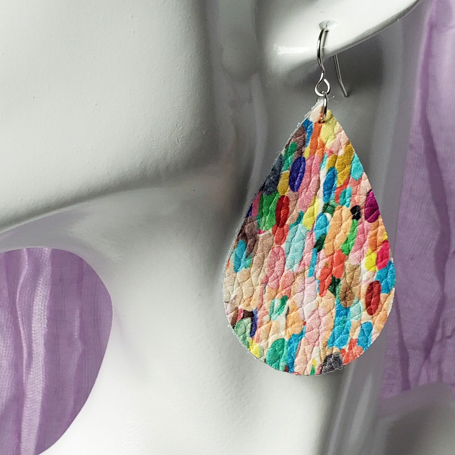 Lightweight leather earrings in solid colors/metallic/sparkle measure approximately 2.25” from bottom of ear wire. Made with stainless steel ear wires.