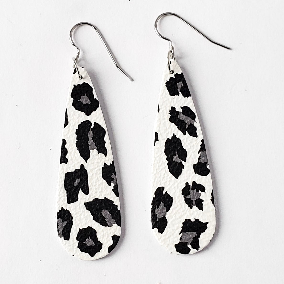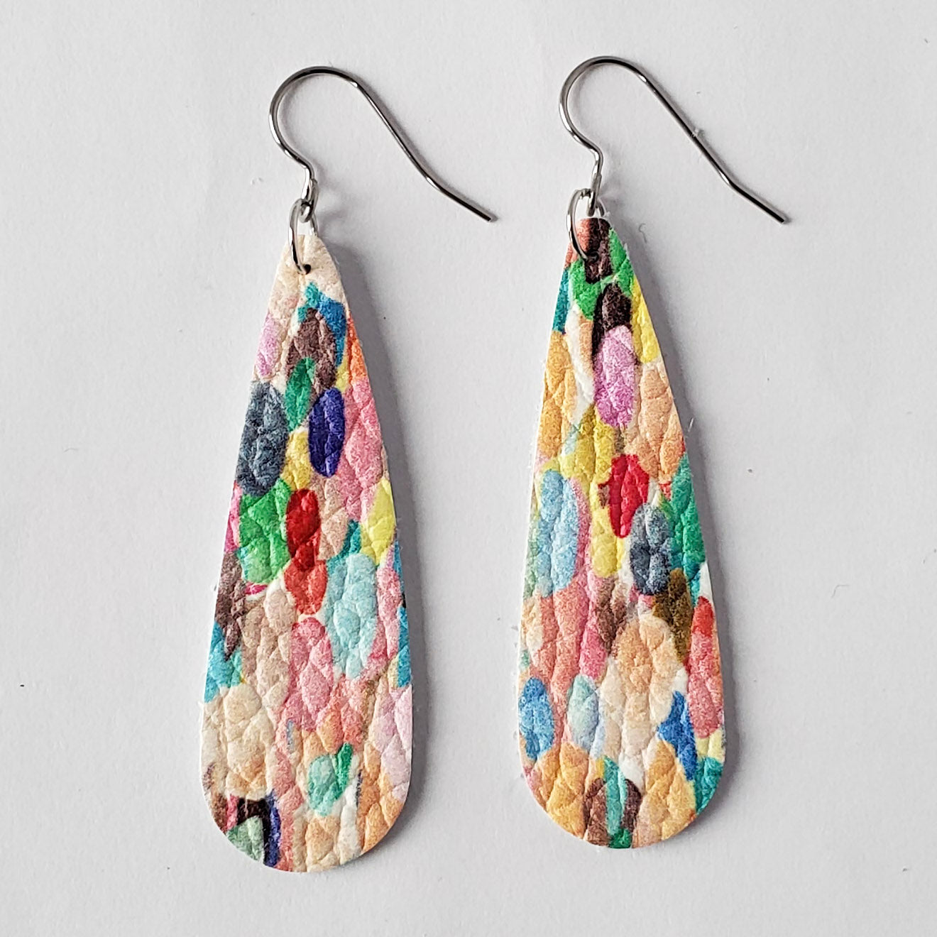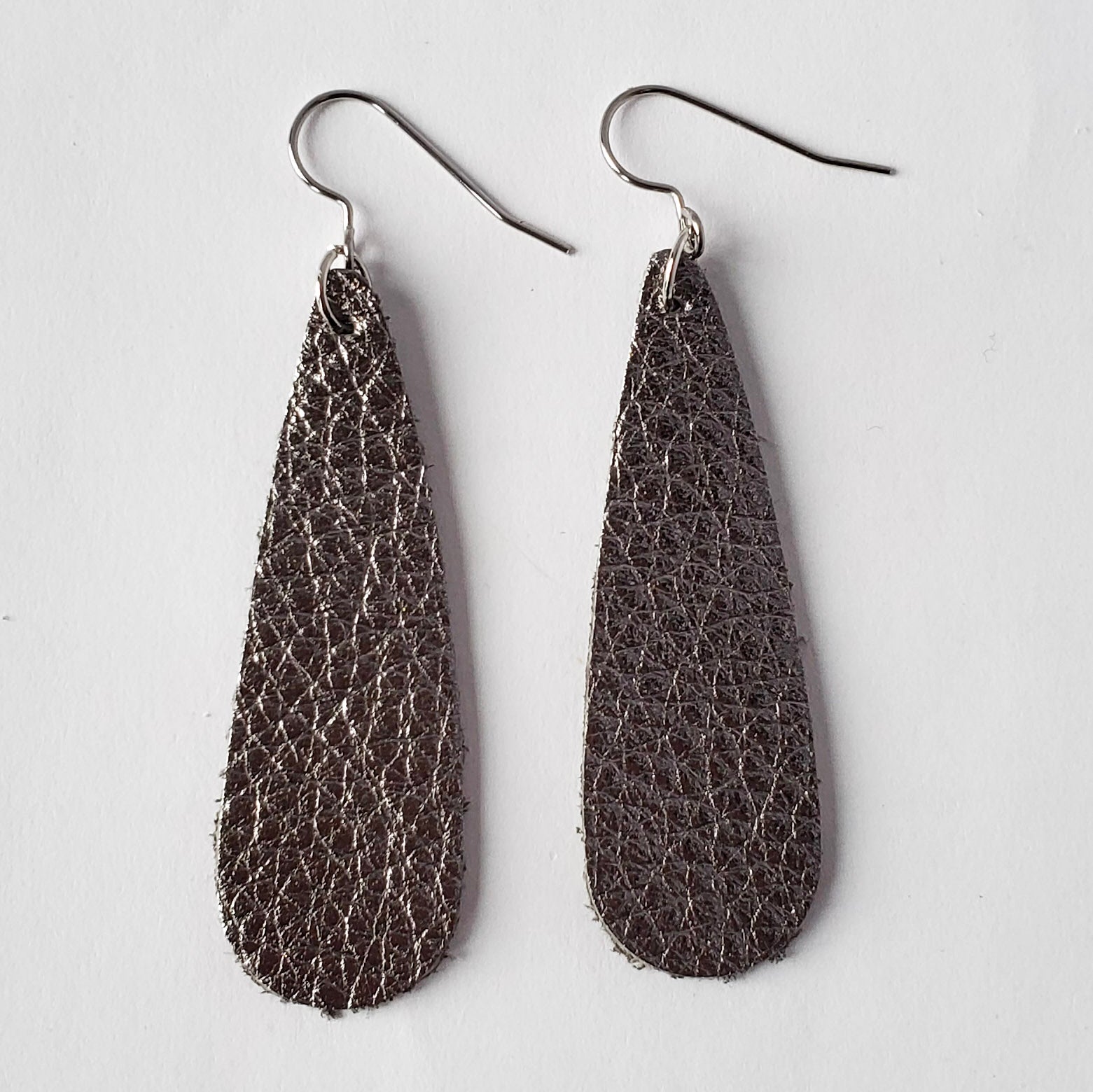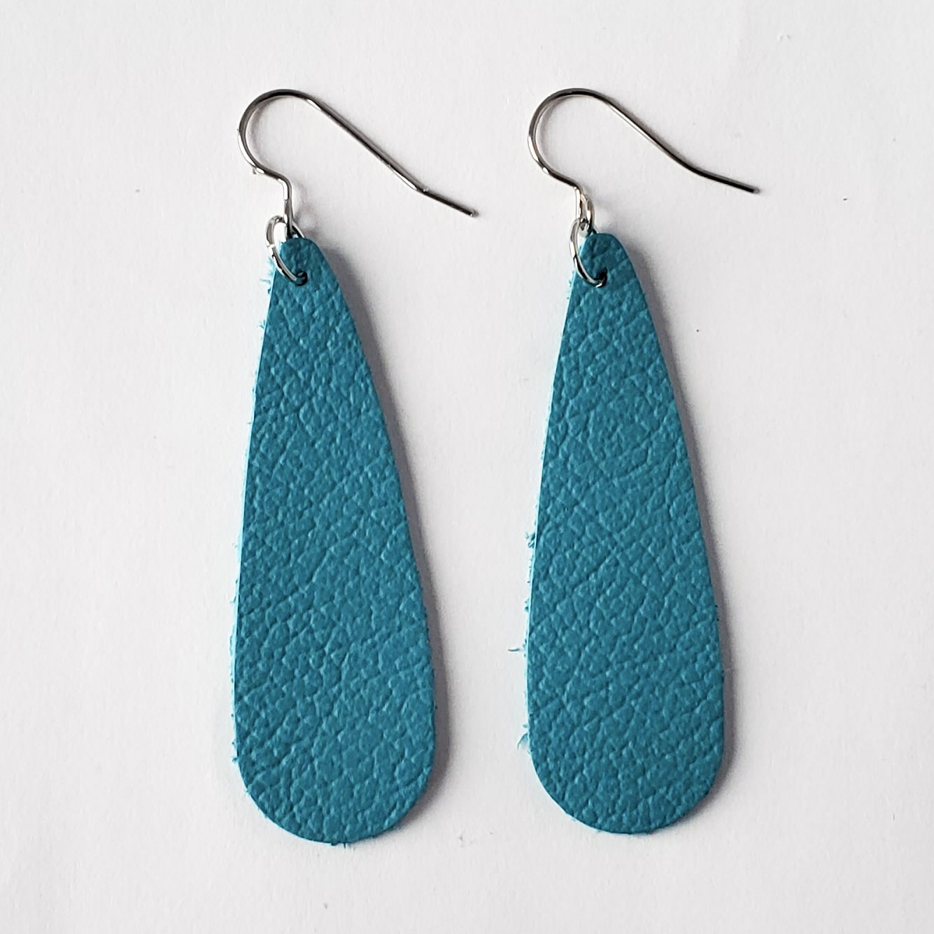 Elongated teardrop leather earrings make an elegant, but fun, statement. Genuine leather in solids and prints measures approximately 2” long and is finished with non-tarnish stainless steel ear wires.