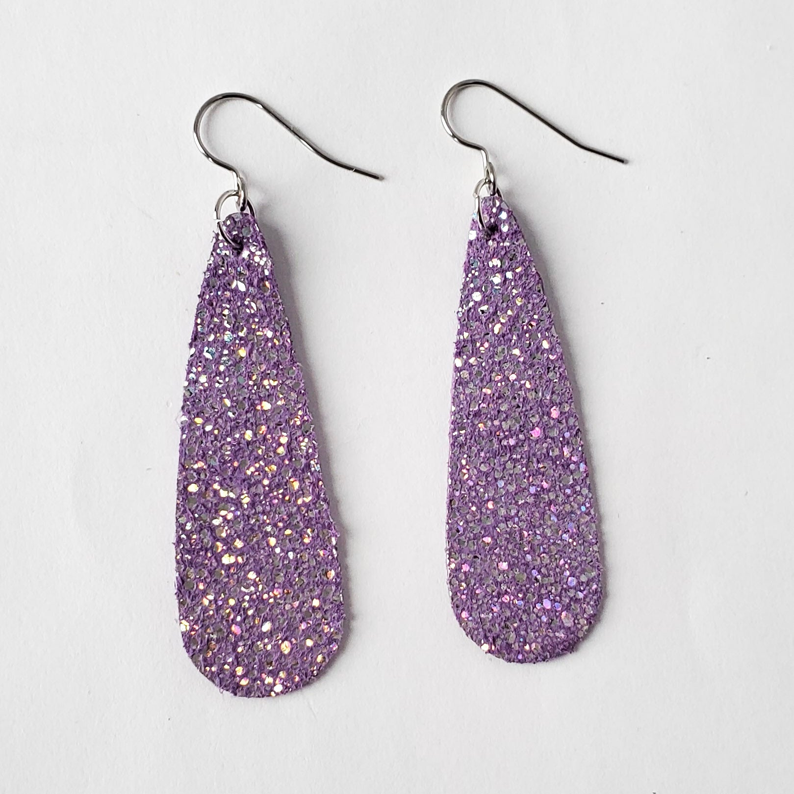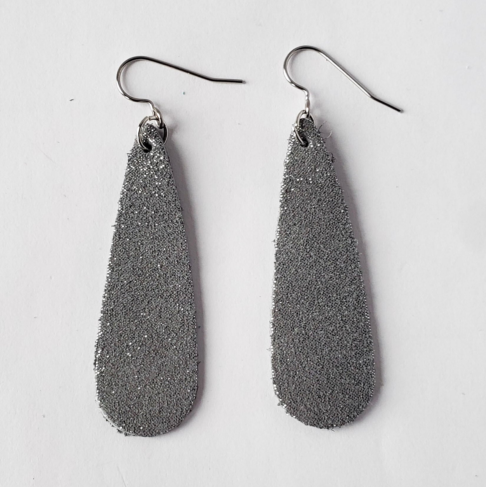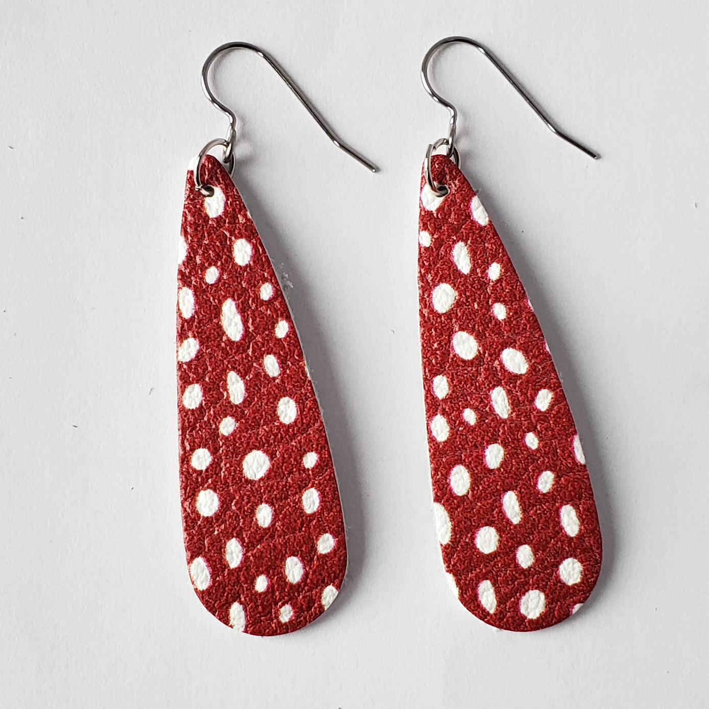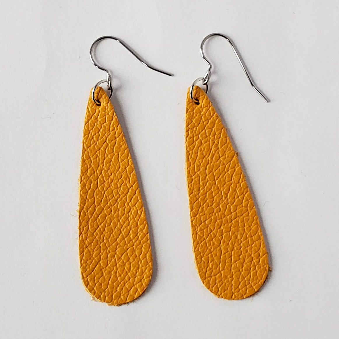 Elongated teardrop leather earrings make an elegant, but fun, statement. Genuine leather in solids and prints measures approximately 2” long and is finished with non-tarnish stainless steel ear wires.