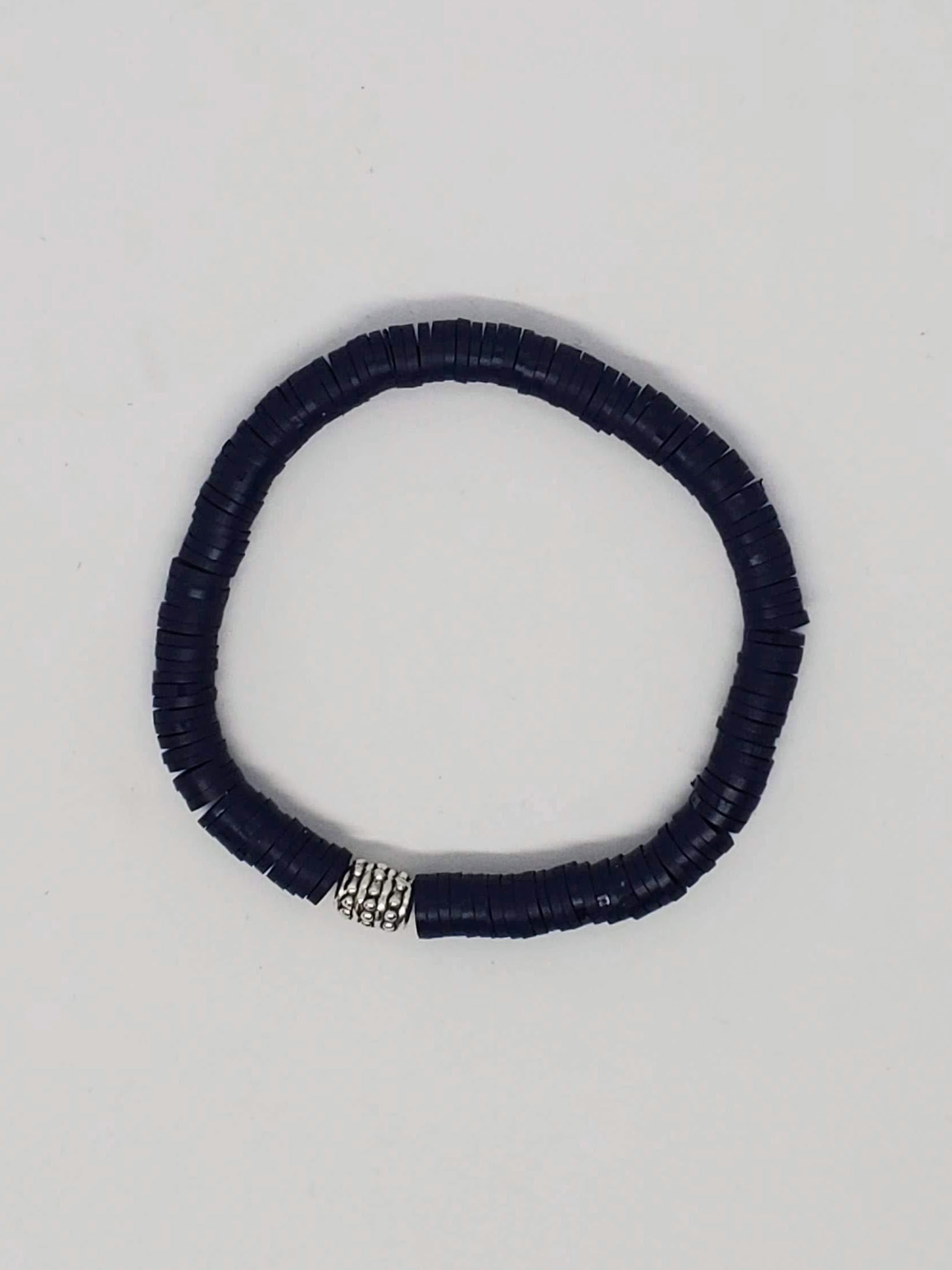 Add this true navy bracelet to your neutral collection. Made with lightweight polymer clay beads and accented with an antique silver plated bead.