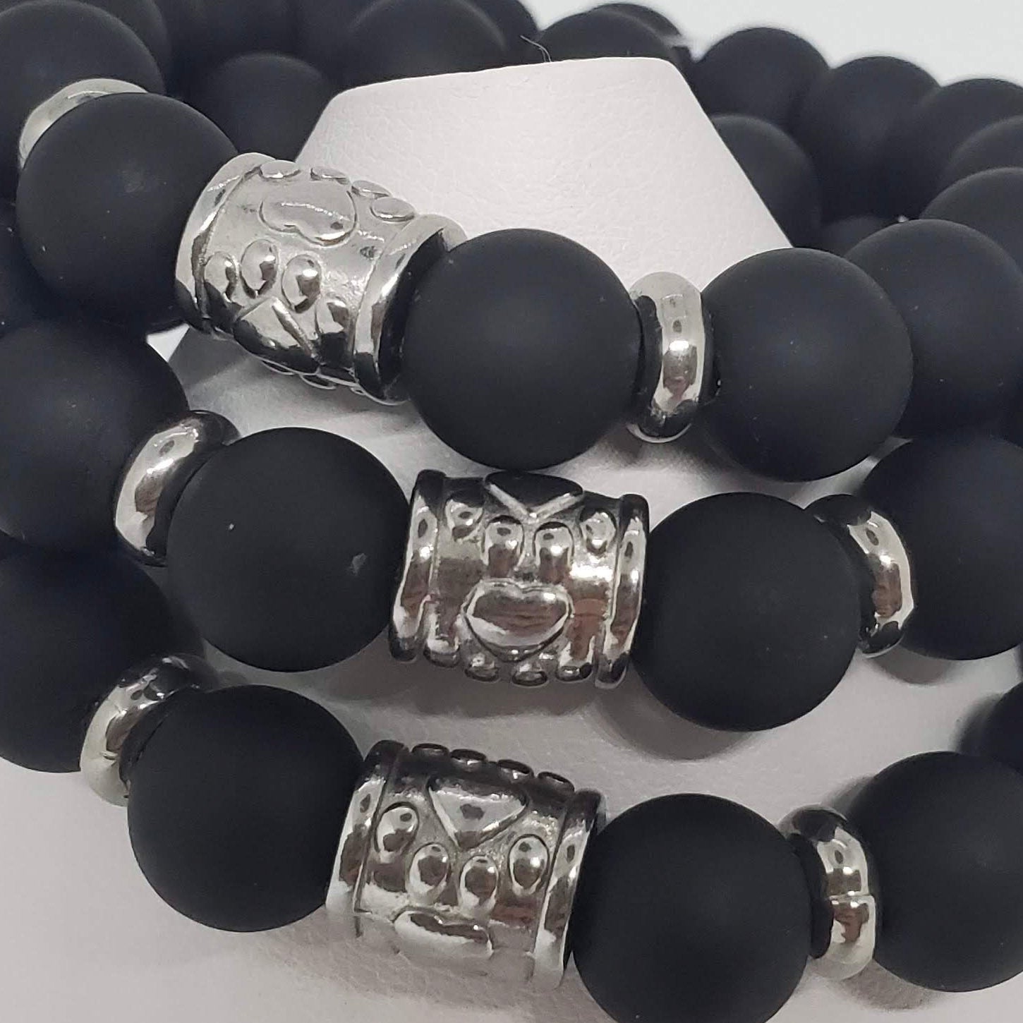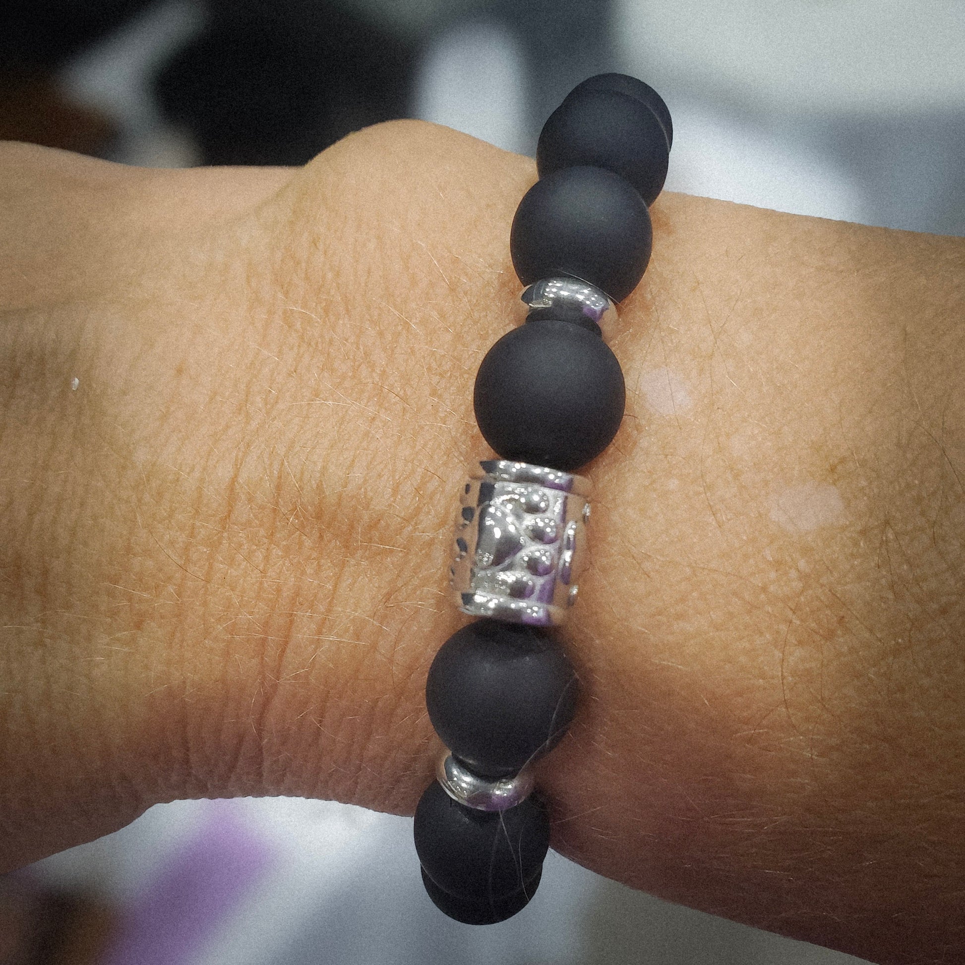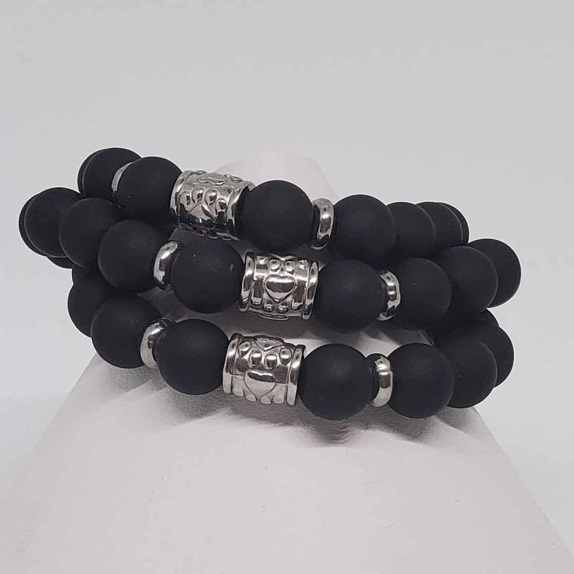 Dog lovers, this one is for you! Made with lightweight, rubberized acrylic beads and finished with stainless steel spacers and a paw print bead. Subtle enough to dress up a bit and perfect for a casual look, this bracelet is also great alone or as part of a stack.