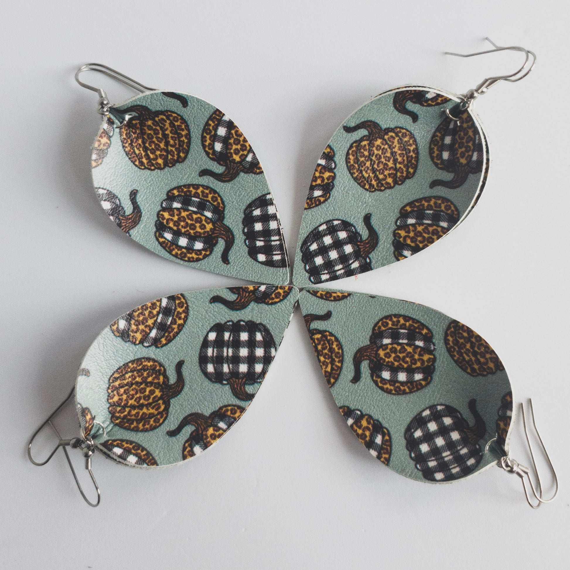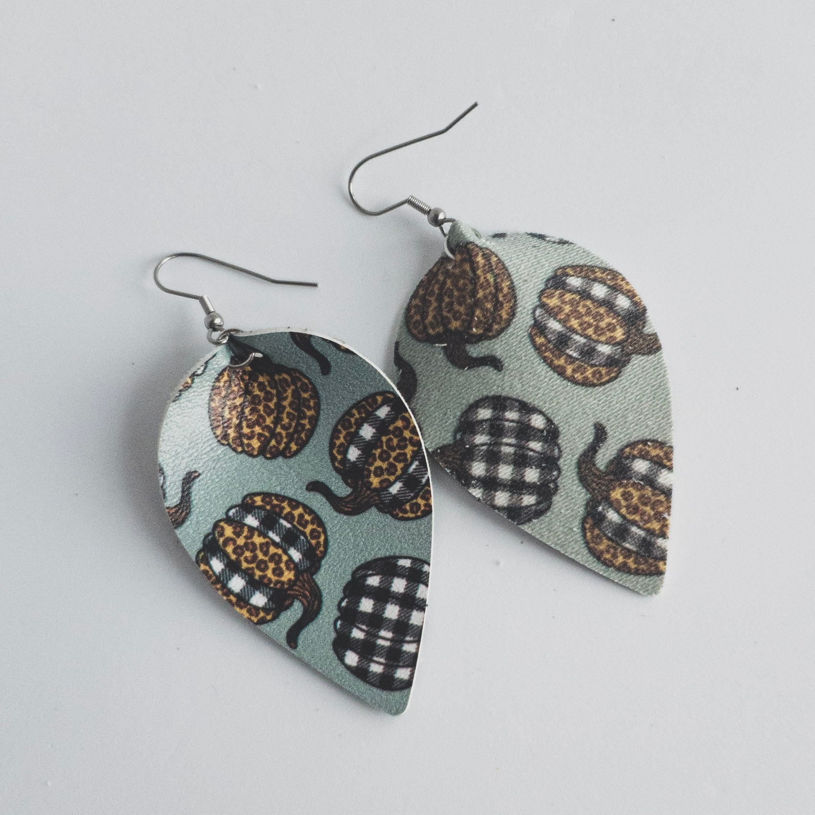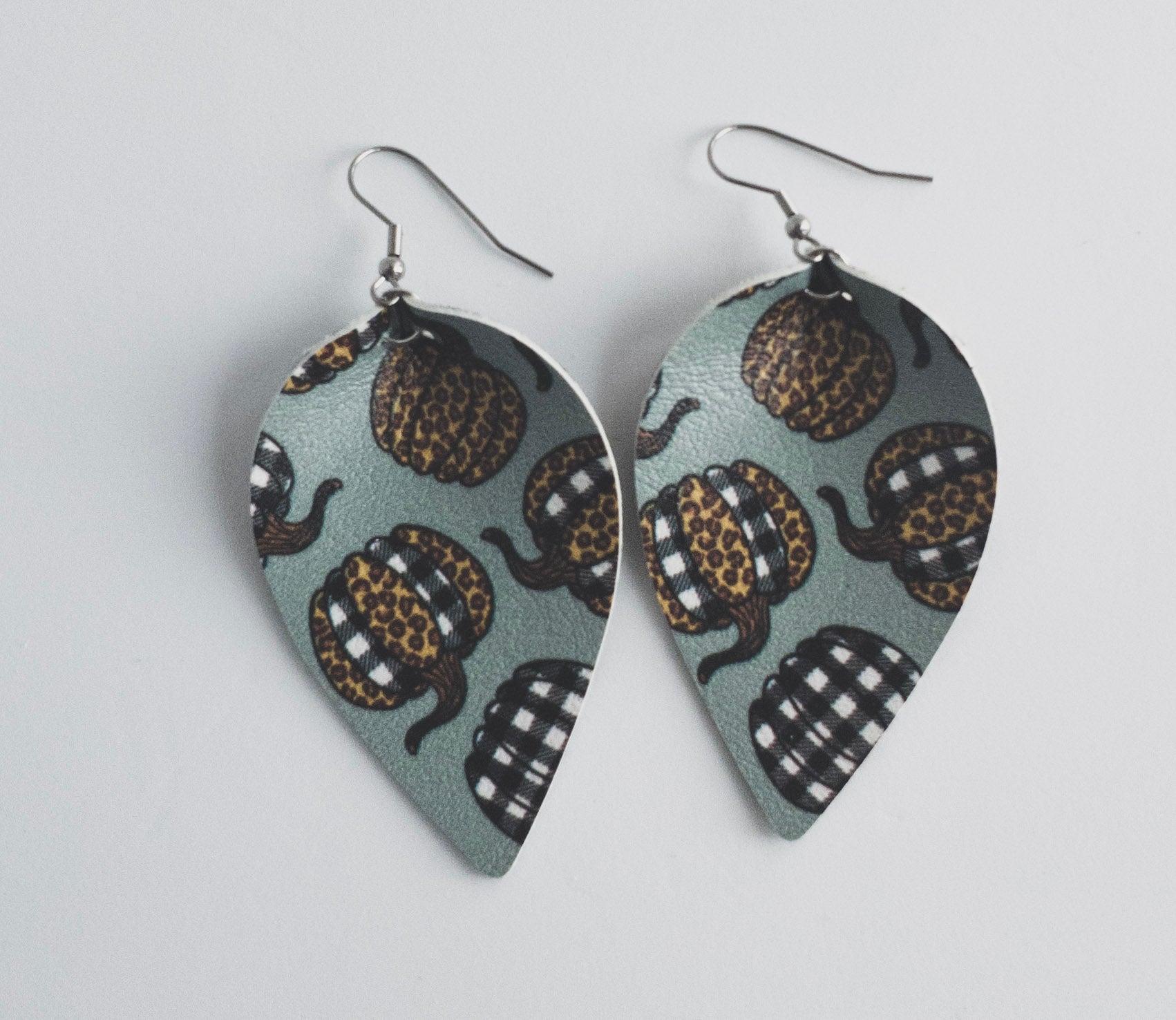 These fall-inspired earrings feature a fun print of buffalo plaid and leopard pumpkins and grayish green background. Available in both genuine leather and vegan leather. Leather style (L) is in a large petal shape and measures approximately 2.5” from bottom of stainless steel ear wires. Vegan leather (V) is printed on BOTH sides in the pinched teardrop shape and measures approximately 2.5” from bottom of stainless steel ear wire.