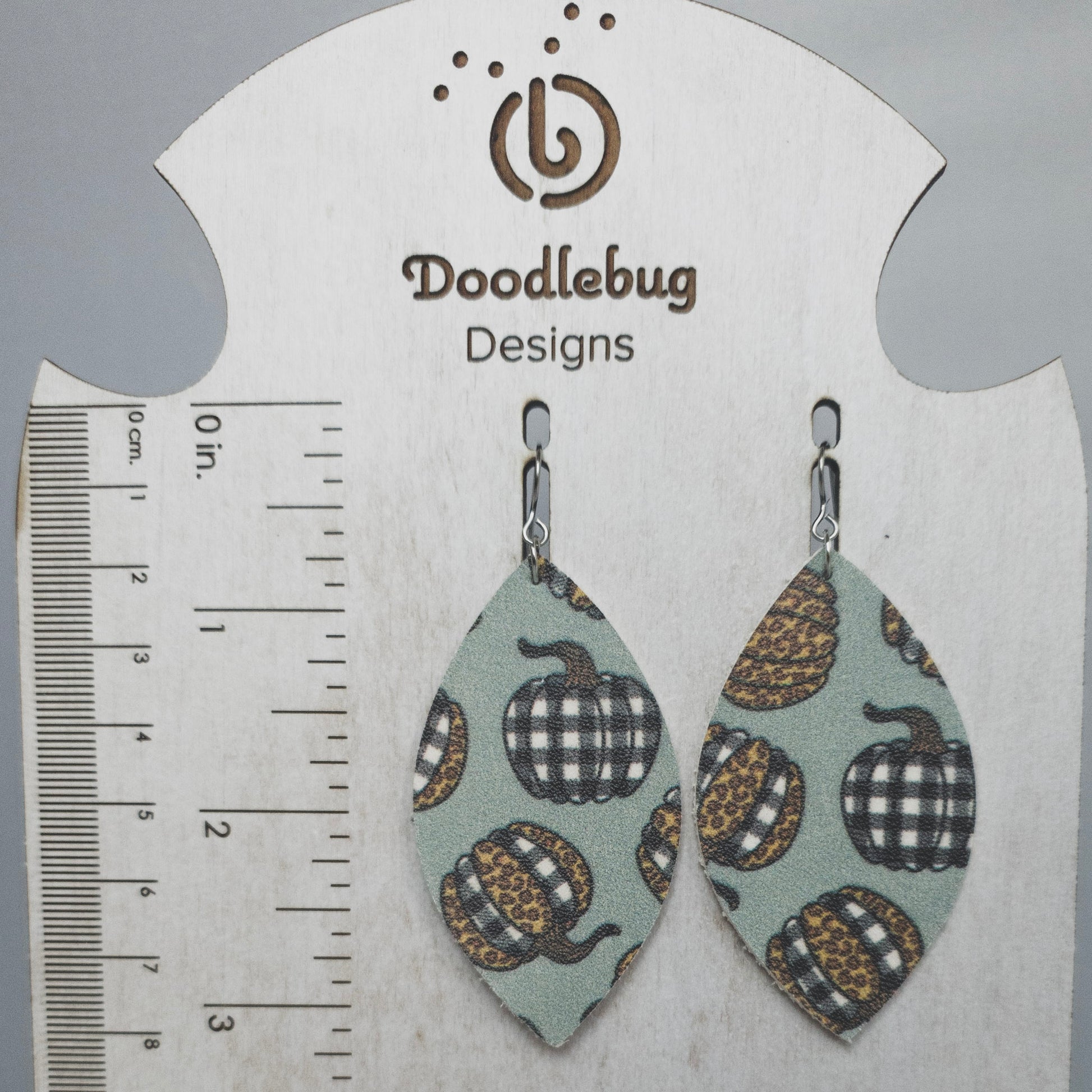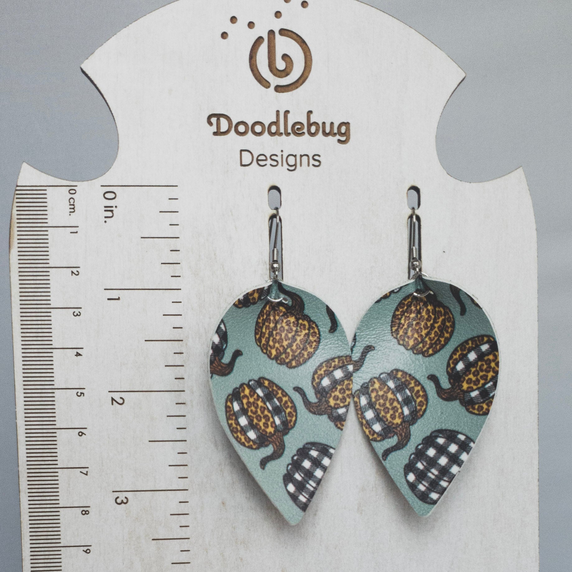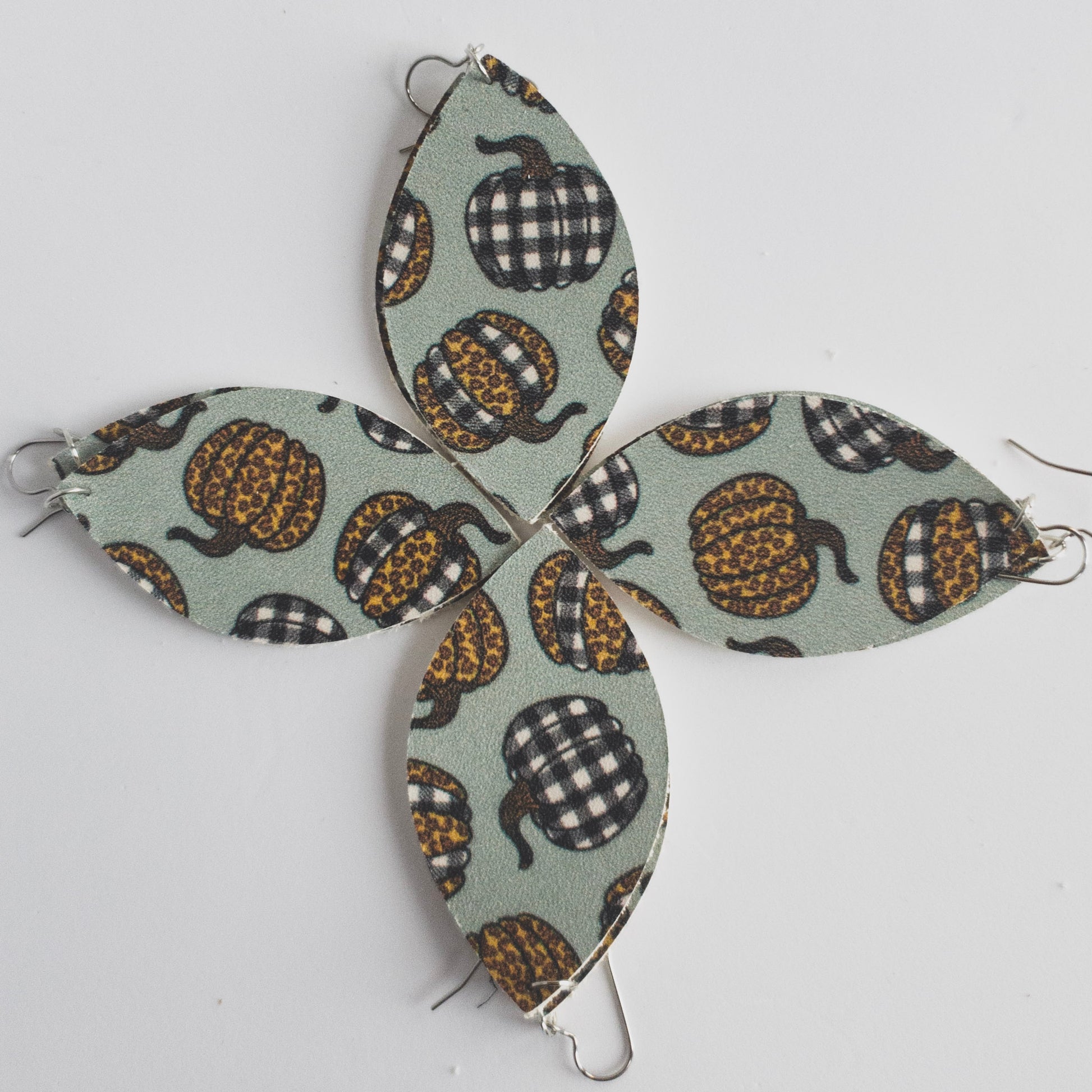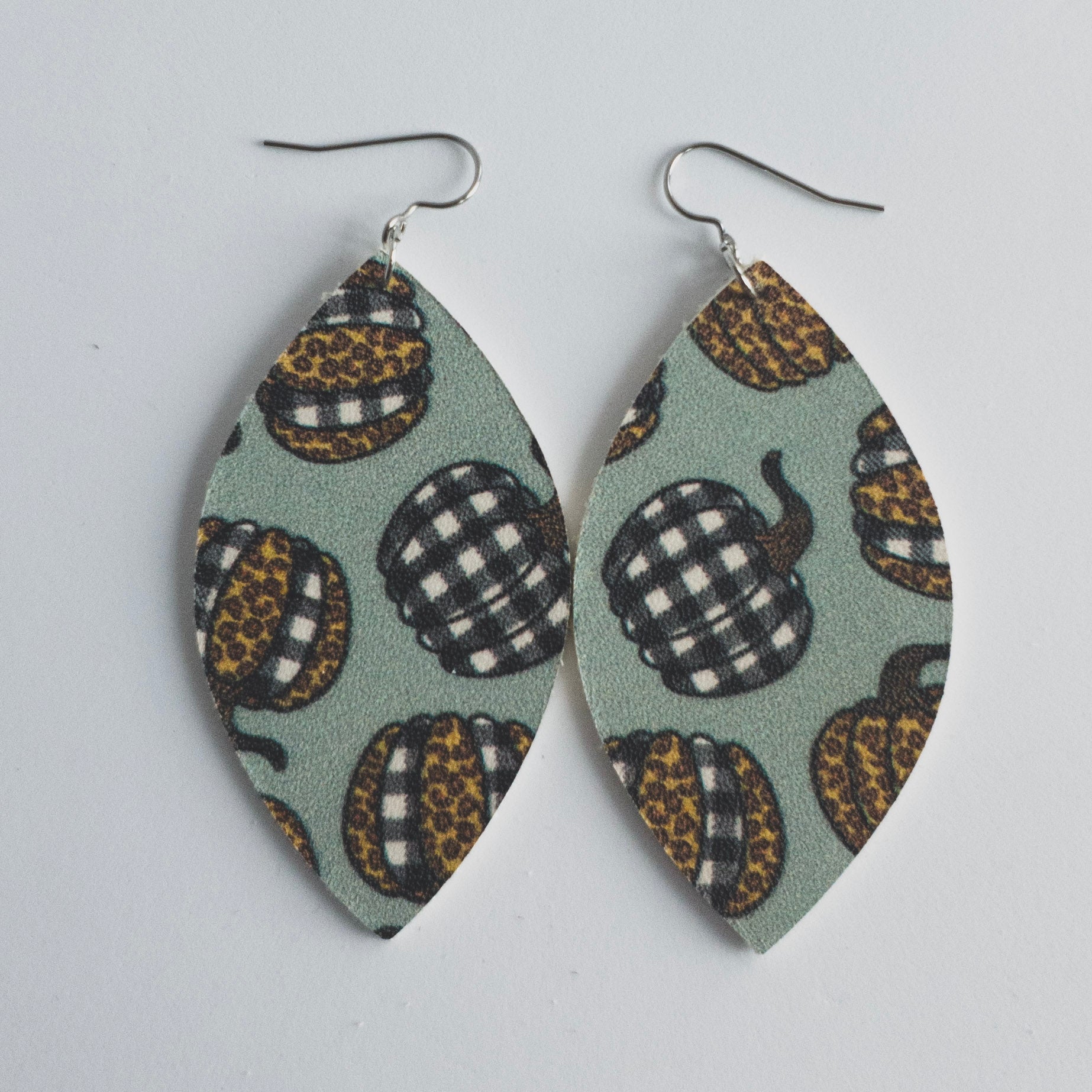 These fall-inspired earrings feature a fun print of buffalo plaid and leopard pumpkins and grayish green background. Available in both genuine leather and vegan leather. Leather style (L) is in a large petal shape and measures approximately 2.5” from bottom of stainless steel ear wires. Vegan leather (V) is printed on BOTH sides in the pinched teardrop shape and measures approximately 2.5” from bottom of stainless steel ear wire.