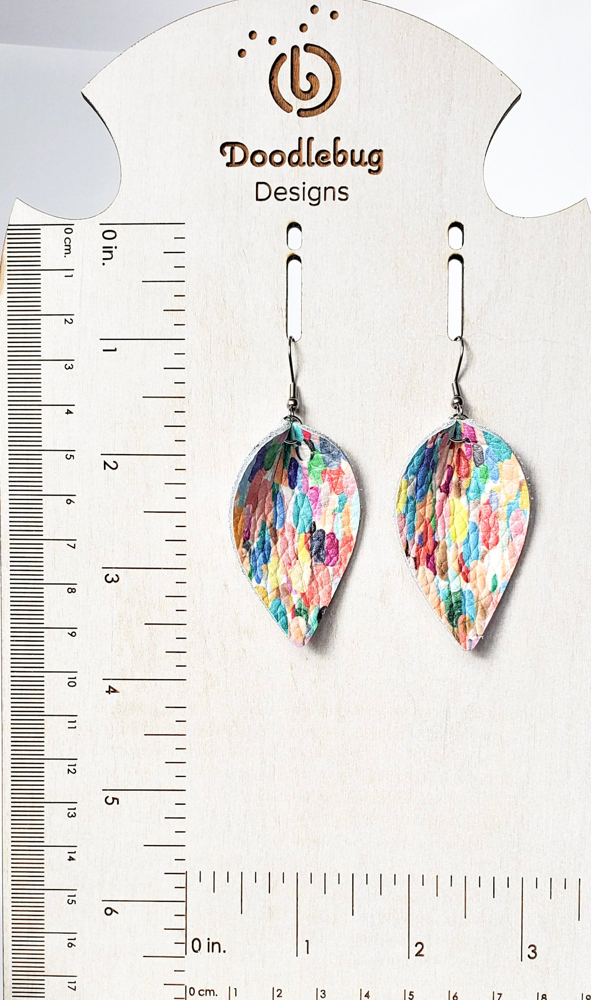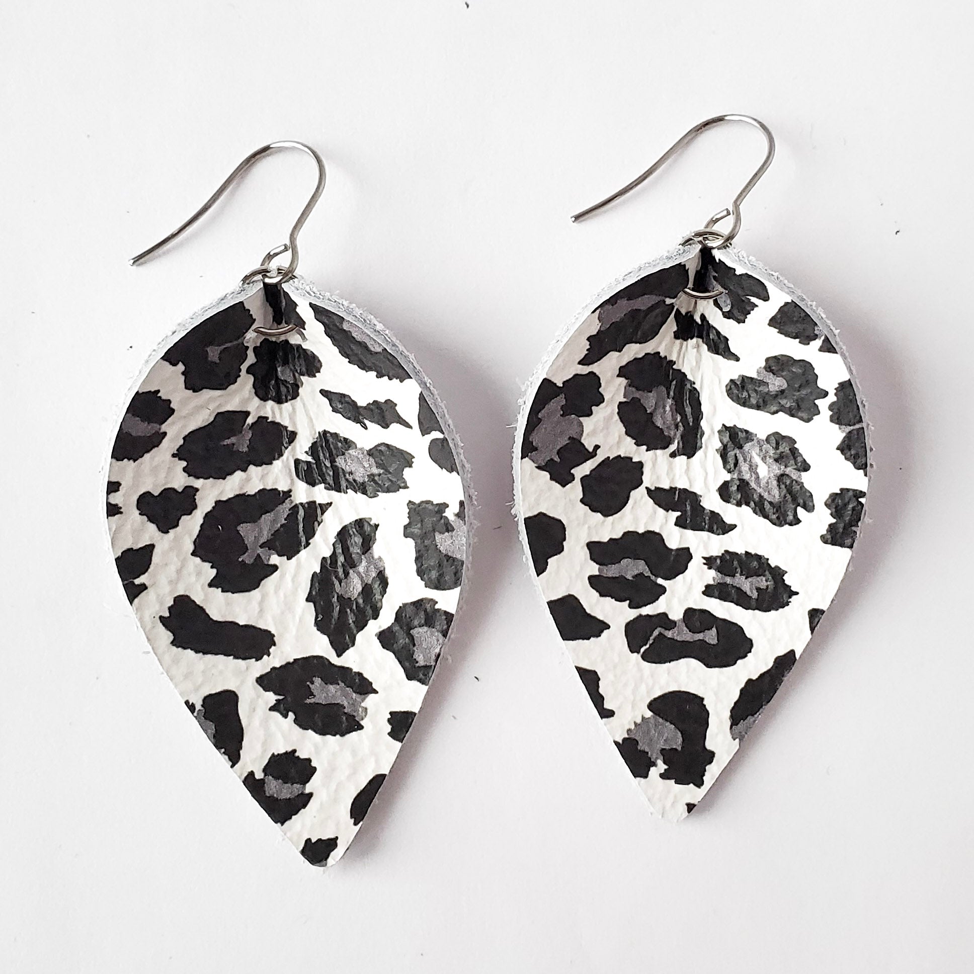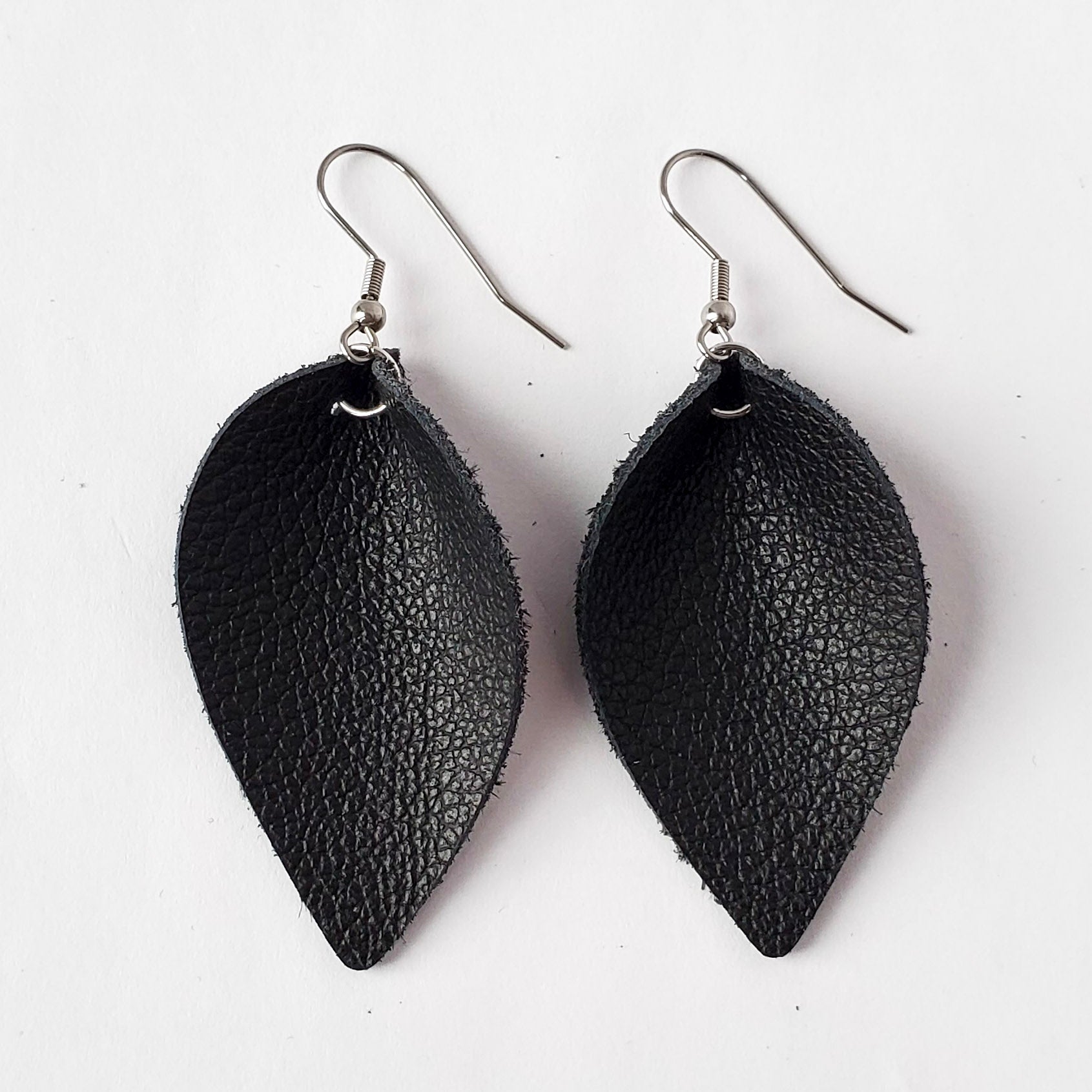 Lightweight leather earrings in a pinched style look good on everyone. Finished with non-tarnish stainless steel ear wires and measures approximately 2” from bottom of ear wire.