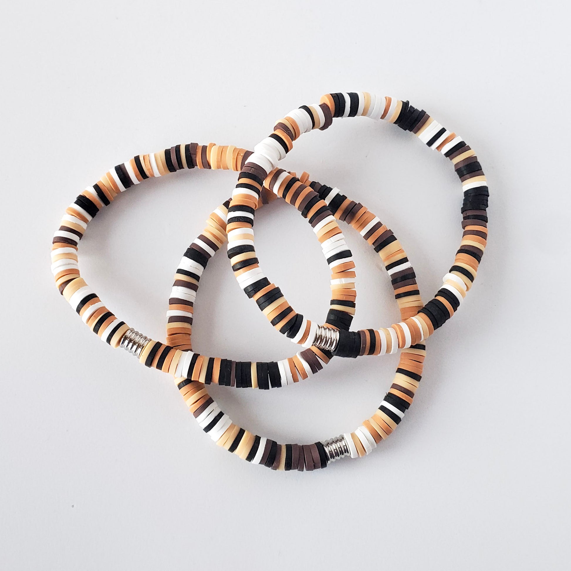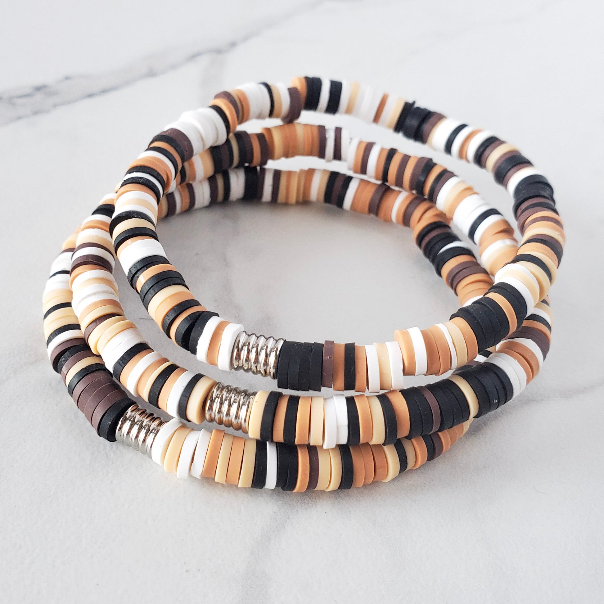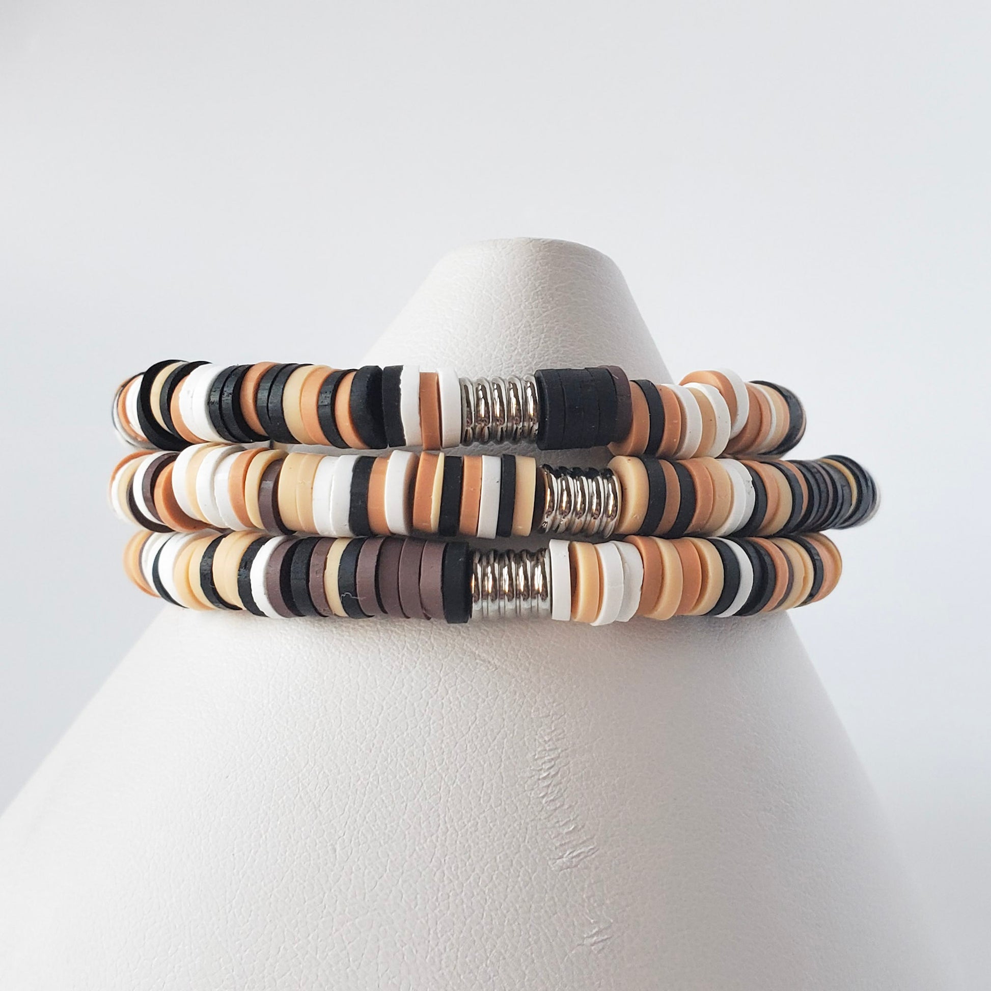The perfect neutral addition to your collection. Shades of brown, white and black 6 mm polymer clay beads are accented with a ribbed stainless steel bead. Looks great alone or stacked with others.