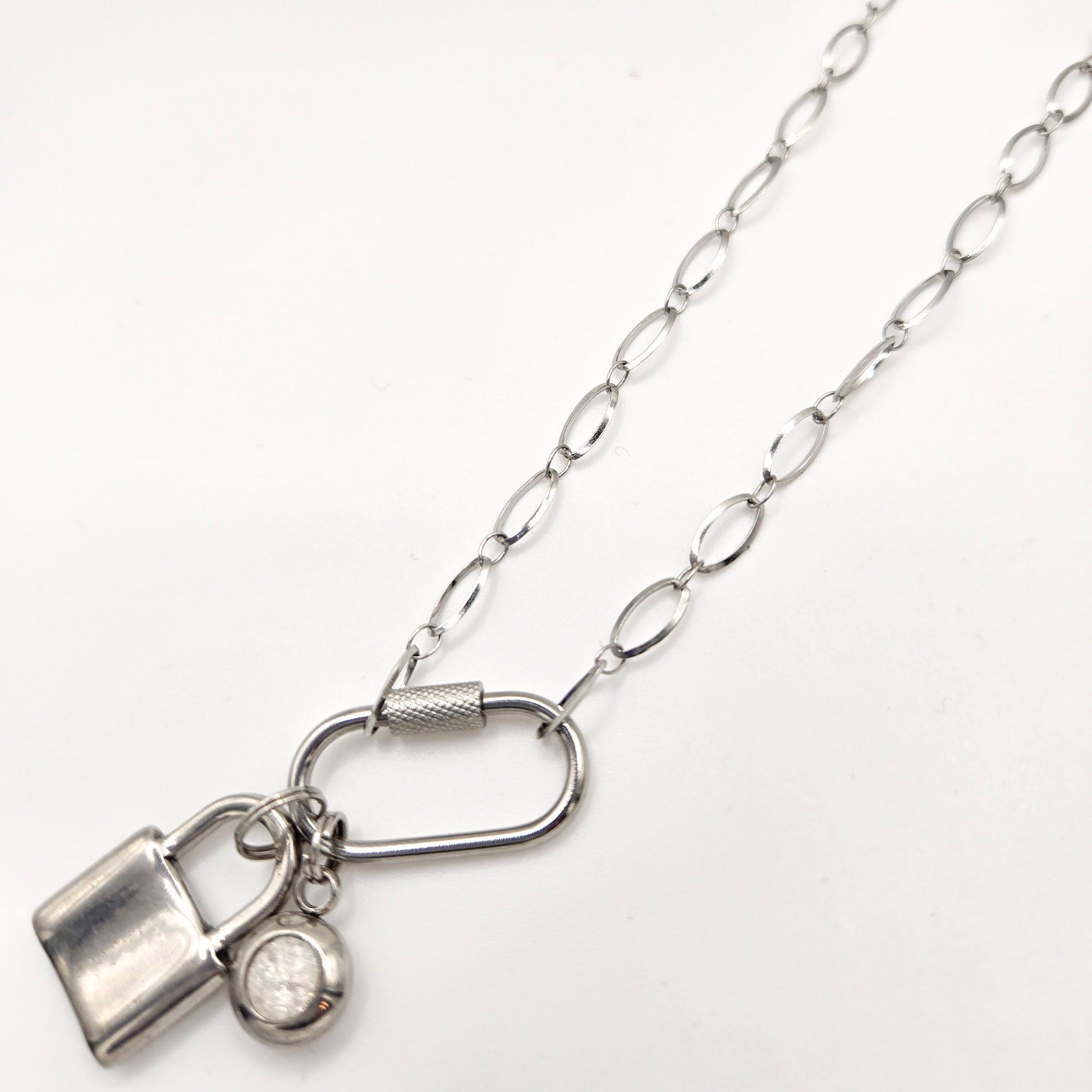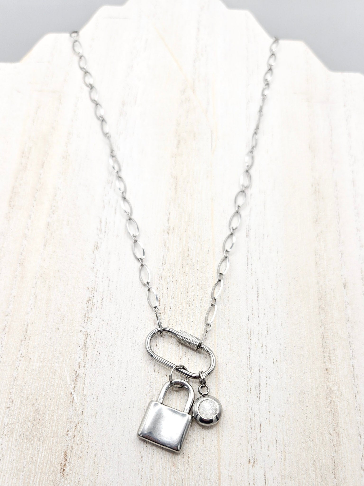 Meet your new favorite layering piece—sleek, versatile, and made to customize. This stainless steel charm necklace features a trendy paperclip-style chain paired with a functional carabiner clasp that unscrews, allowing you to easily add or swap charms whenever you’d like.