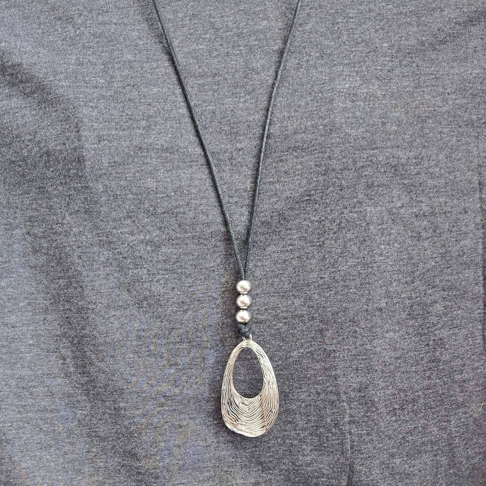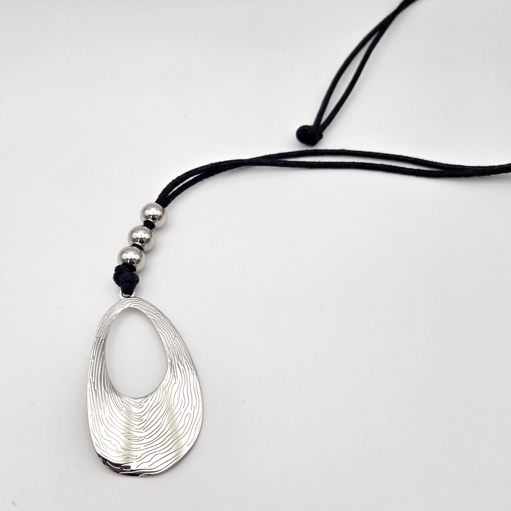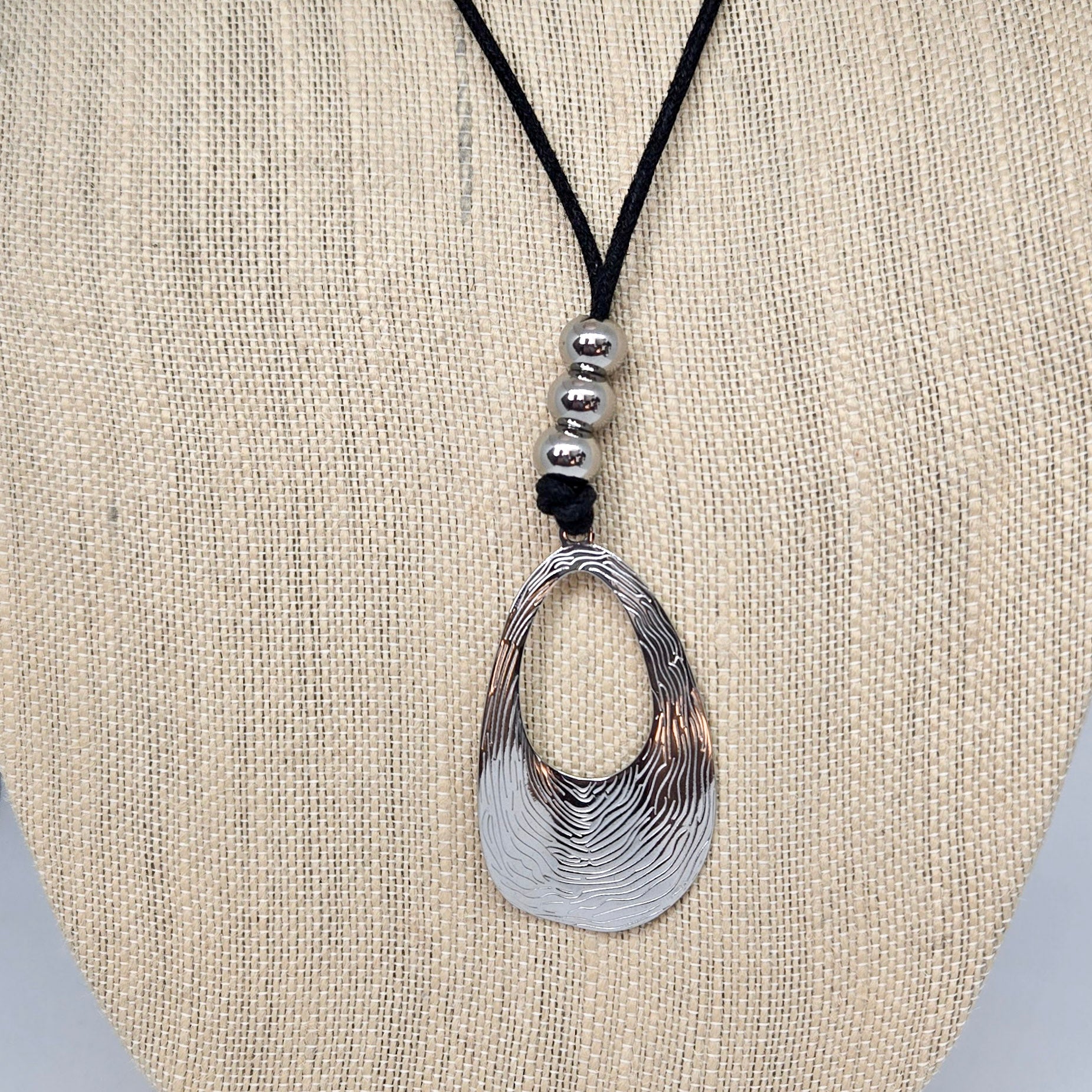 Beautiful and substantial 2.25" stainless steel pendant features swirls that give it added dimension. This beauty will be worn on repeat and can be dressed up or down. Accented with stainless steel beads and suspended from an approximately 30" durable black cotton cord.
