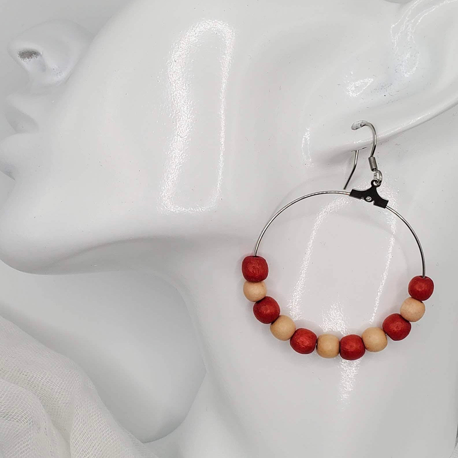 Glass beads (4mm) are color drenched shades of red, yellow and black. Wood beads (6mm) are more subdued hues of red, black and muted gold beads.