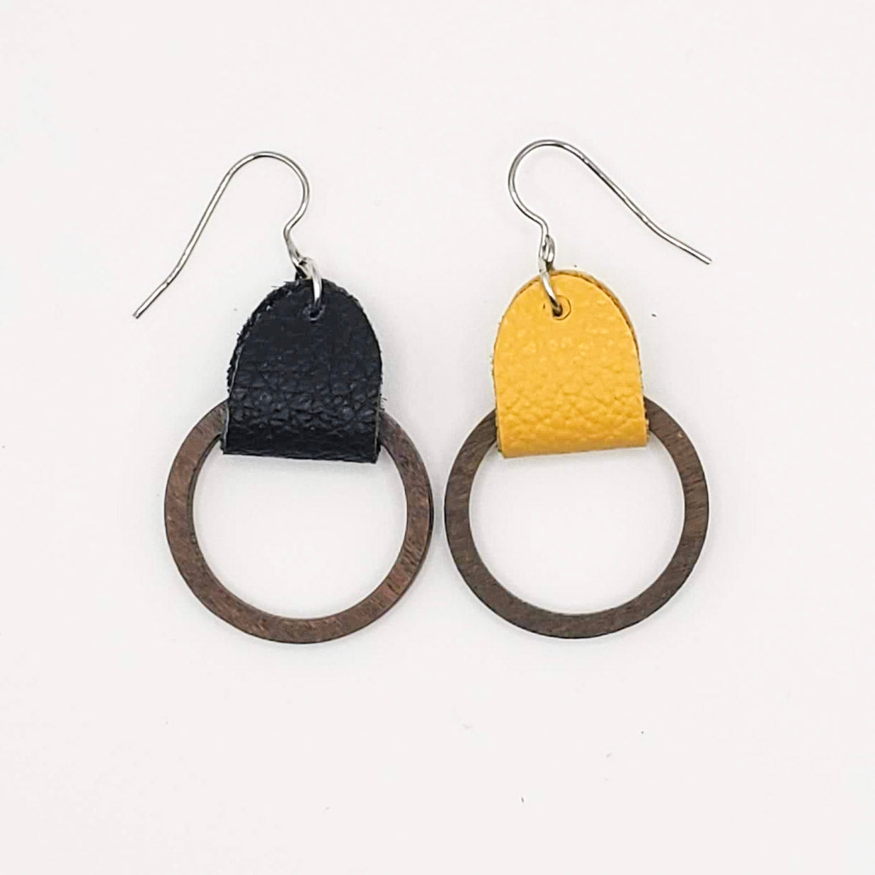 You need these earrings for game day, or any day you want to rep your favorite team. Made with high quality leather, these earrings are finished with non-tarnish stainless steel ear wires. Hoops are walnut wood and each will be unique.