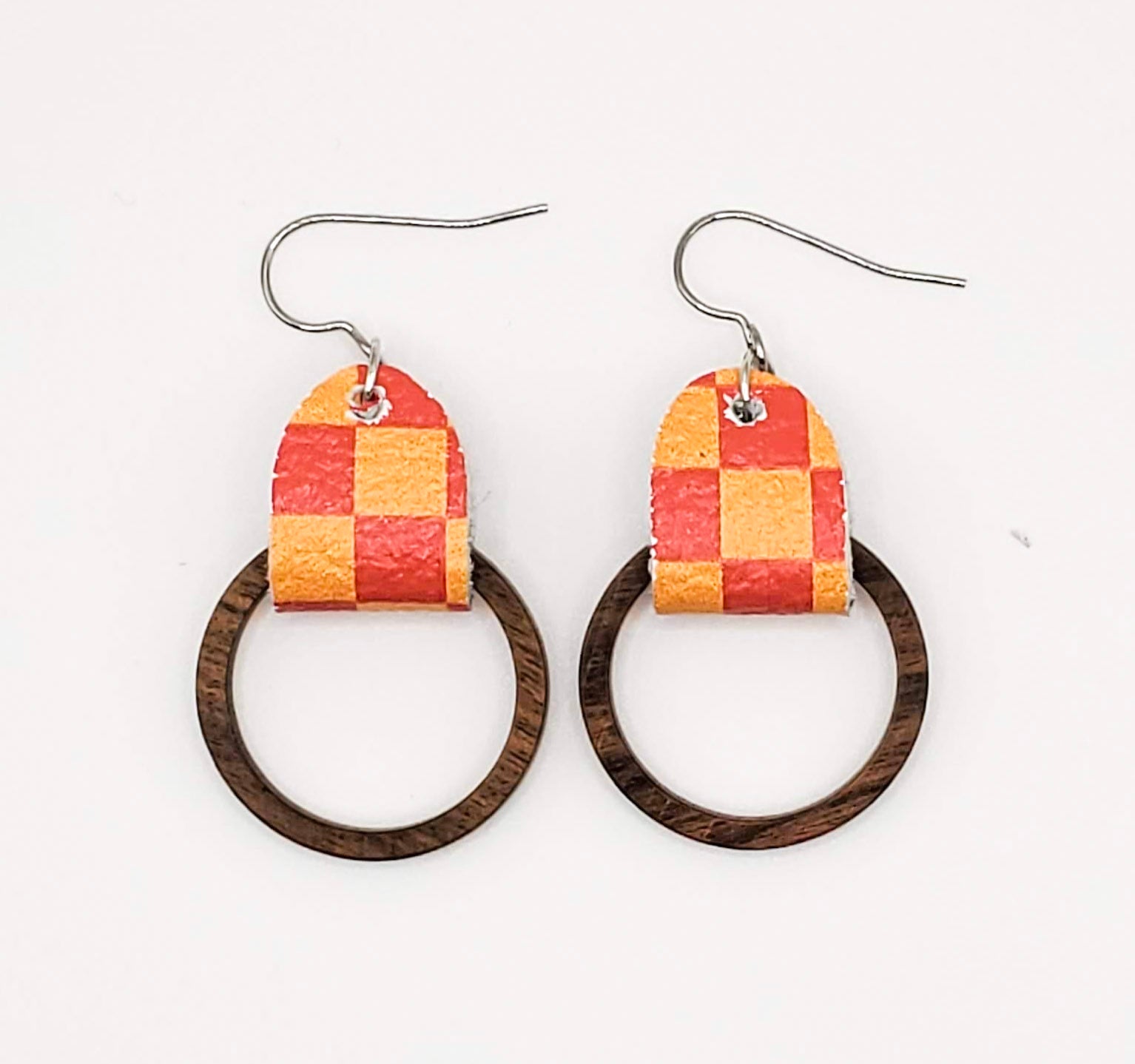 You need these earrings for game day, or any day you want to rep your favorite team. Made with high quality leather, or cork backed with leather (black & gold), these earrings are finished with non-tarnish stainless steel ear wires. Hoops are walnut wood and each will be unique.