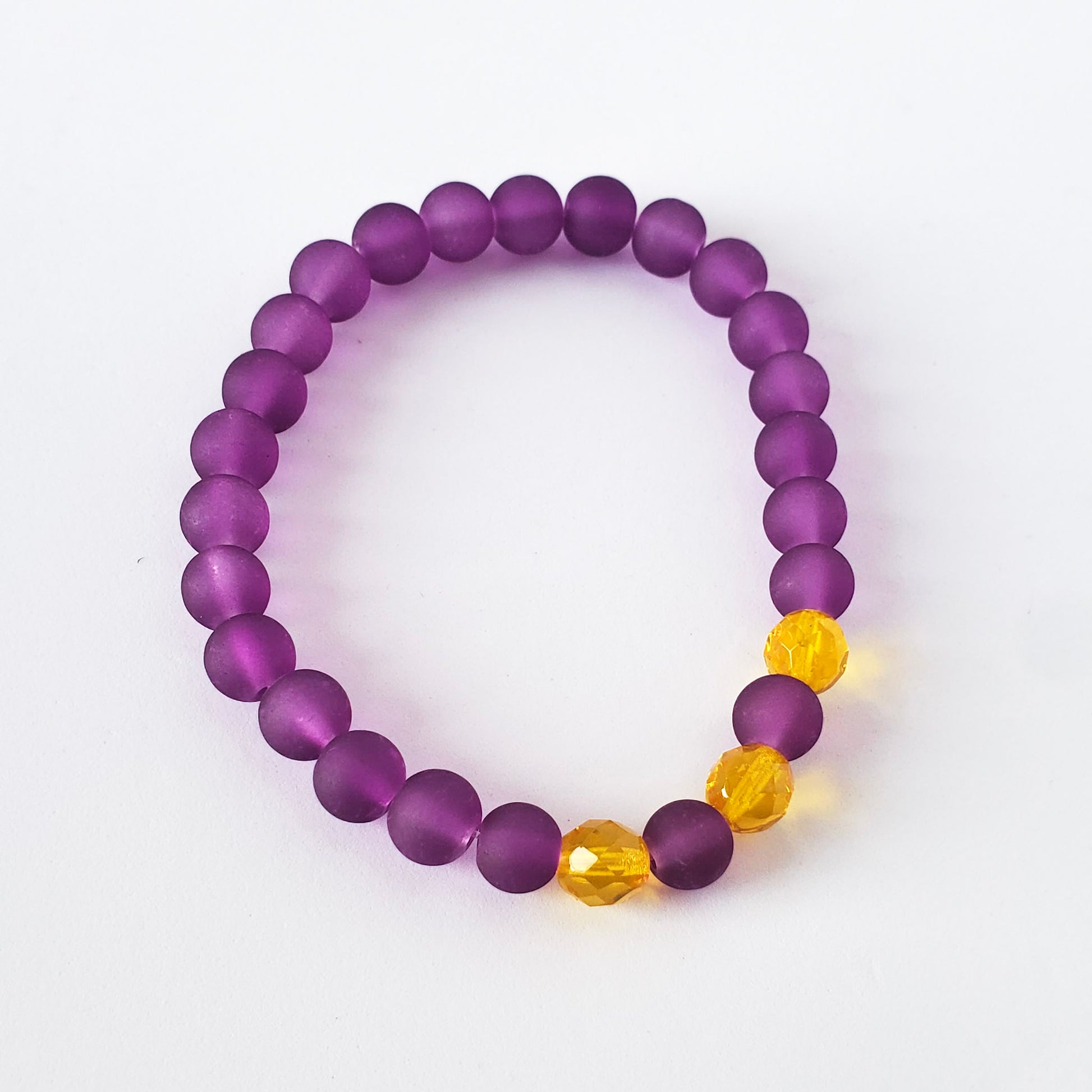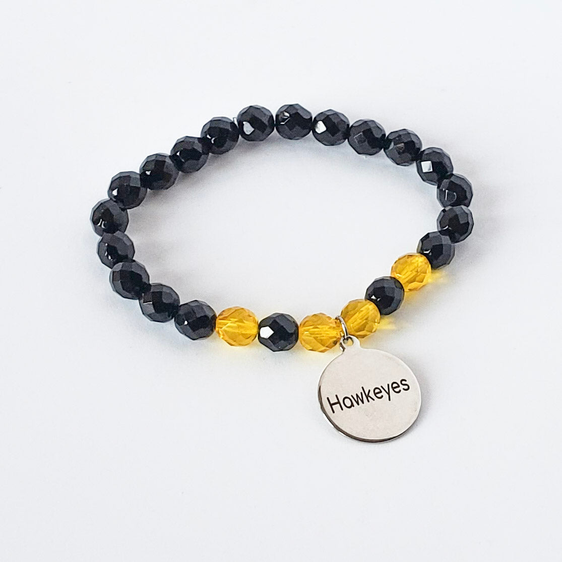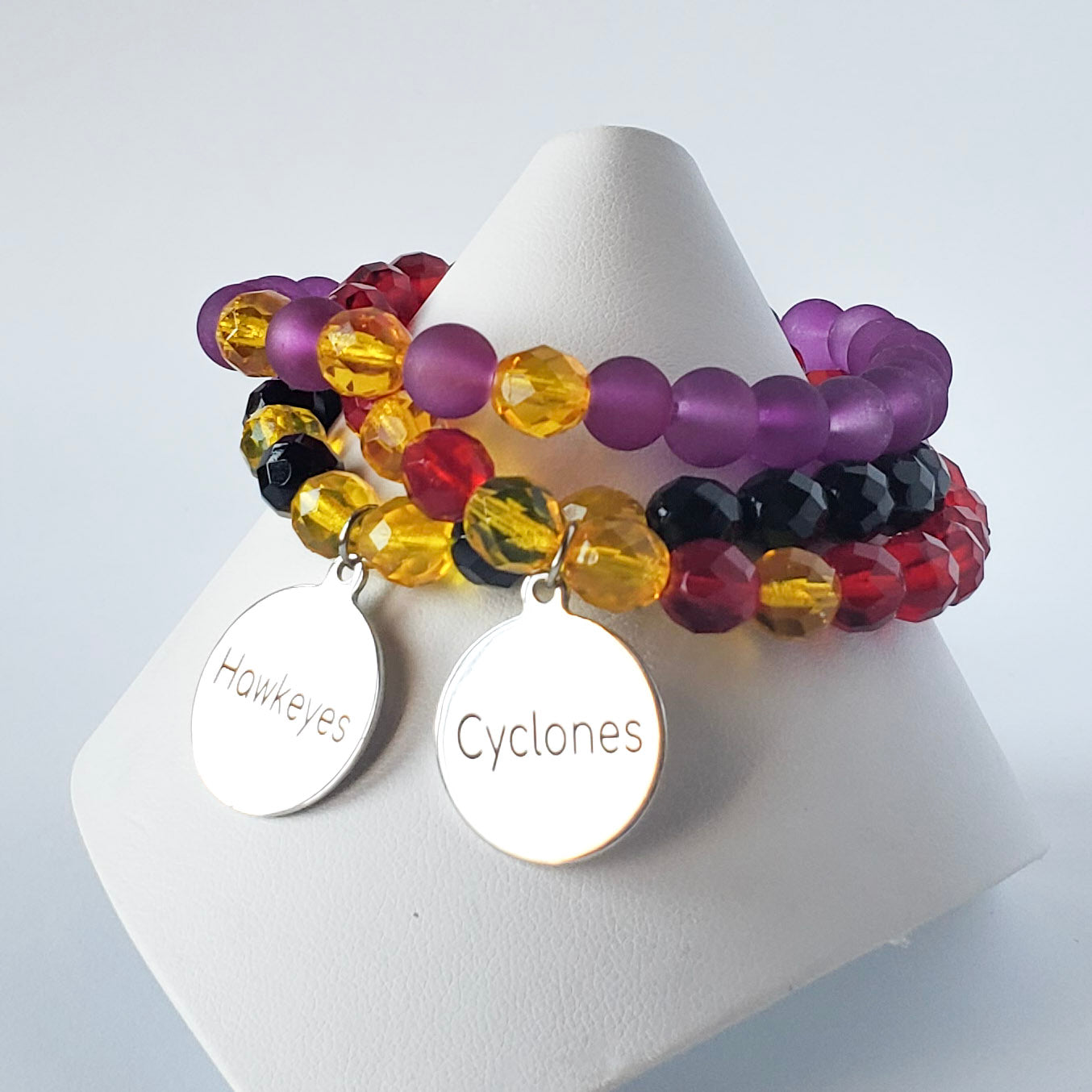 Support your favorite team with these beautiful bracelets. Made with quality 8mm glass beads in either frosted smooth glass and/or fine faceted Czech glass beads. Black and red bracelets are accented with non-tarnish 20mm stainless steel charms.