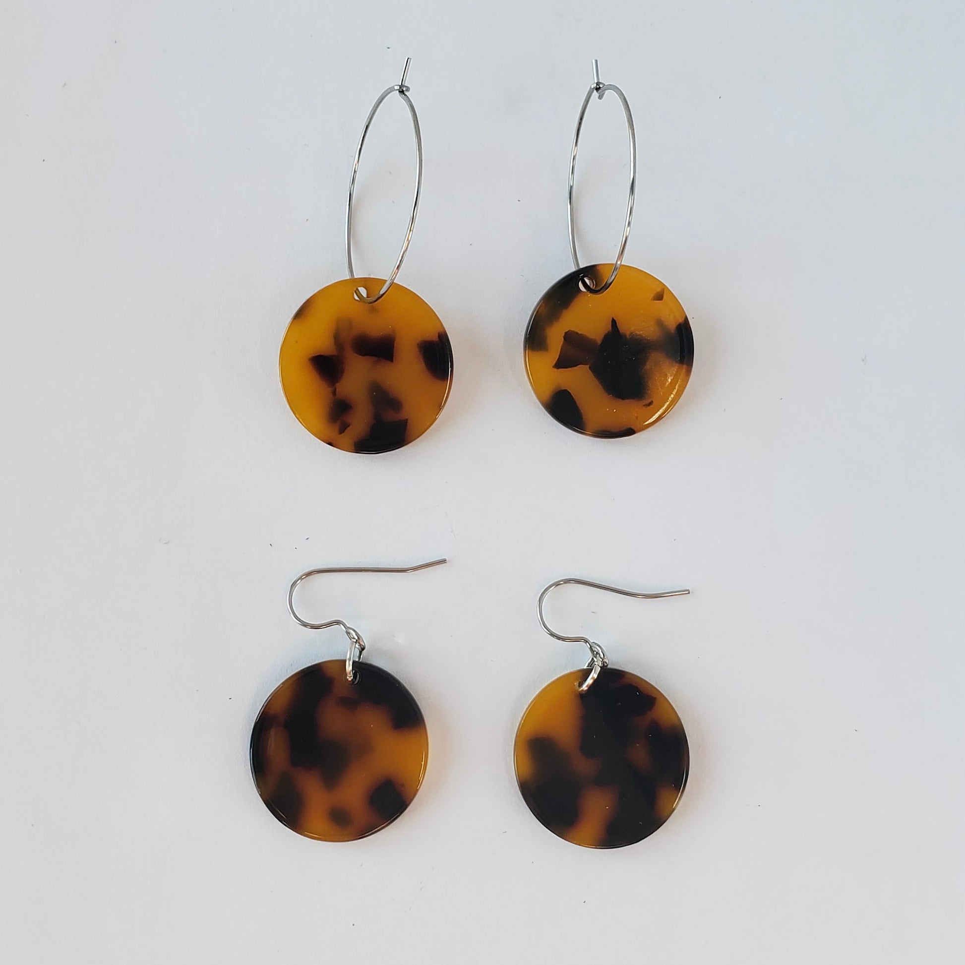 Lightweight and fun earrings in the classic tortoise shell print will make these a favorite in your collection. Made with non-tarnish stainless steel ear wires or stainless steel 1” hoop.