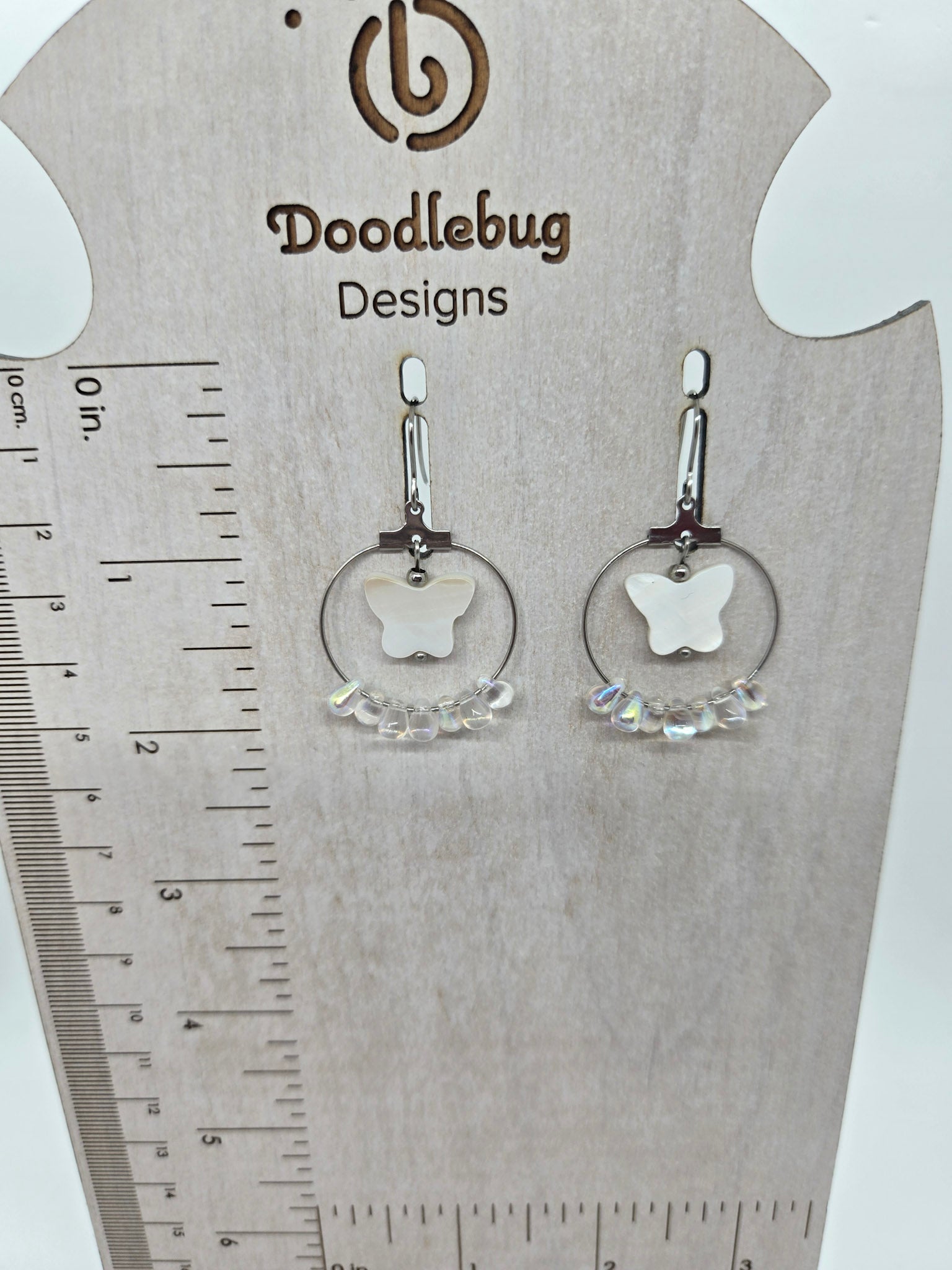 Let these earrings remind you that change can be beautiful. Mother of pearl shell butterfly is framed with a stainless steel hoop and accented with iridescent teardrop glass beads for a stunning look that isn't heavy. Finished with stainless steel ear wires that won't tarnish or wear off.
