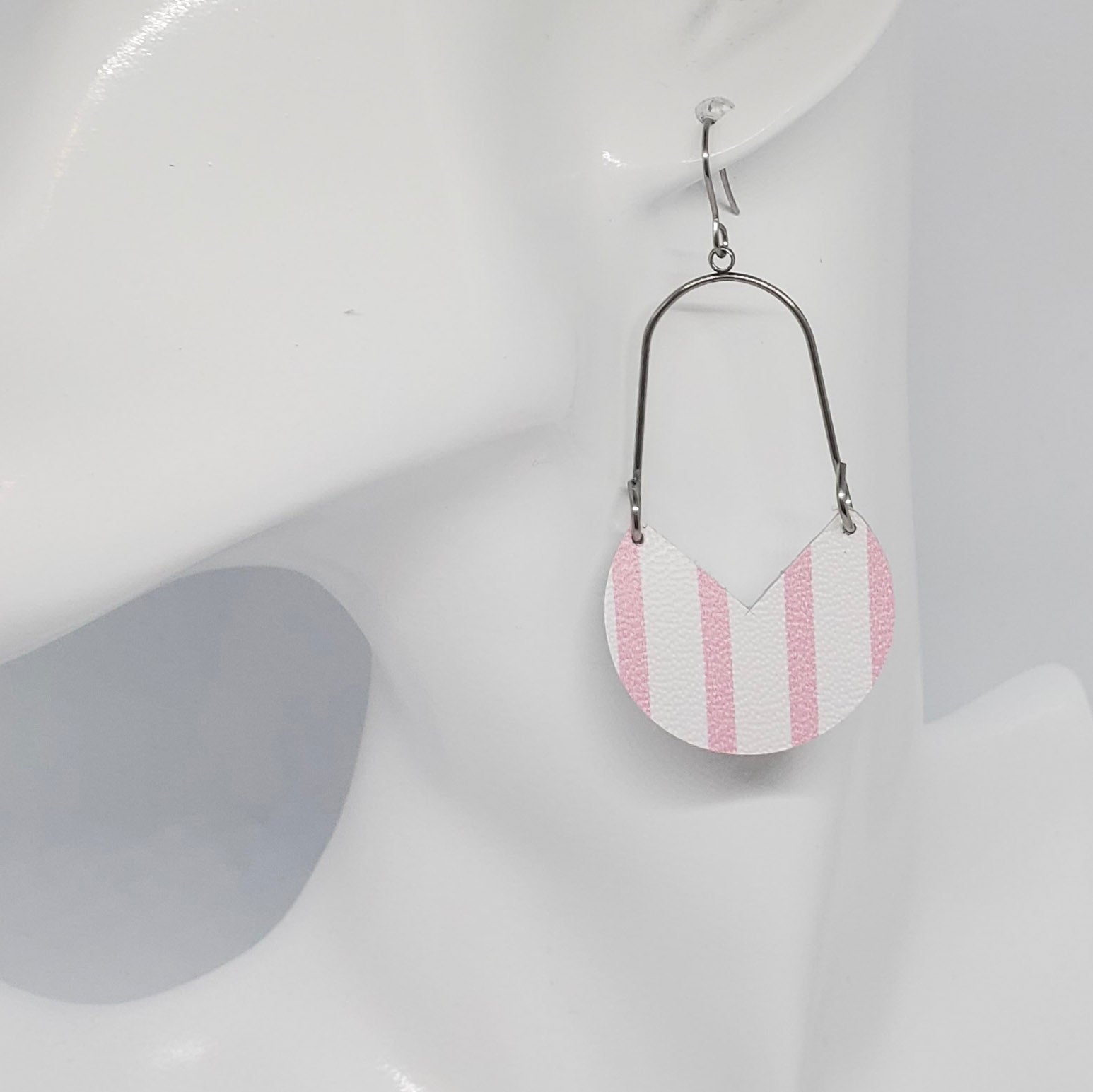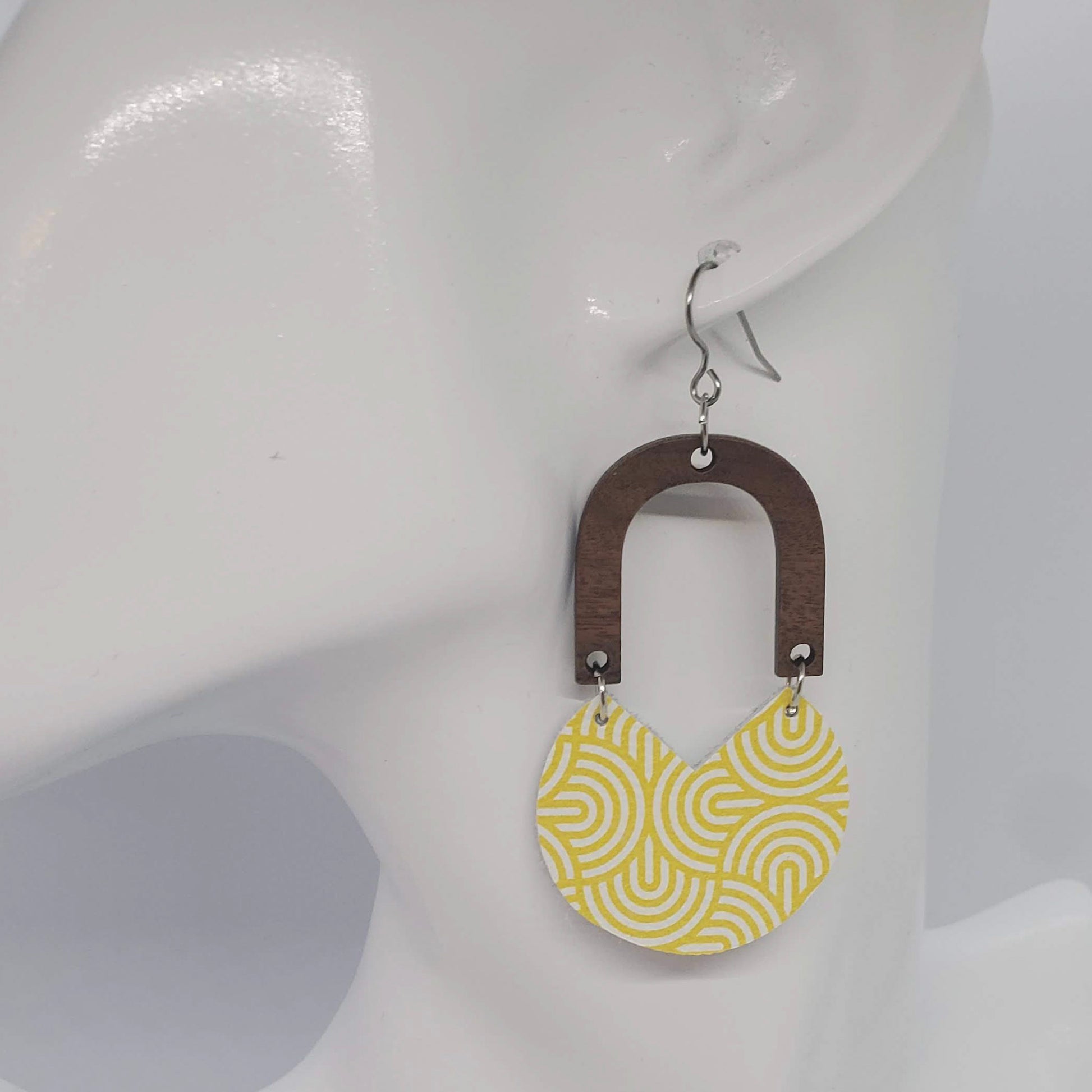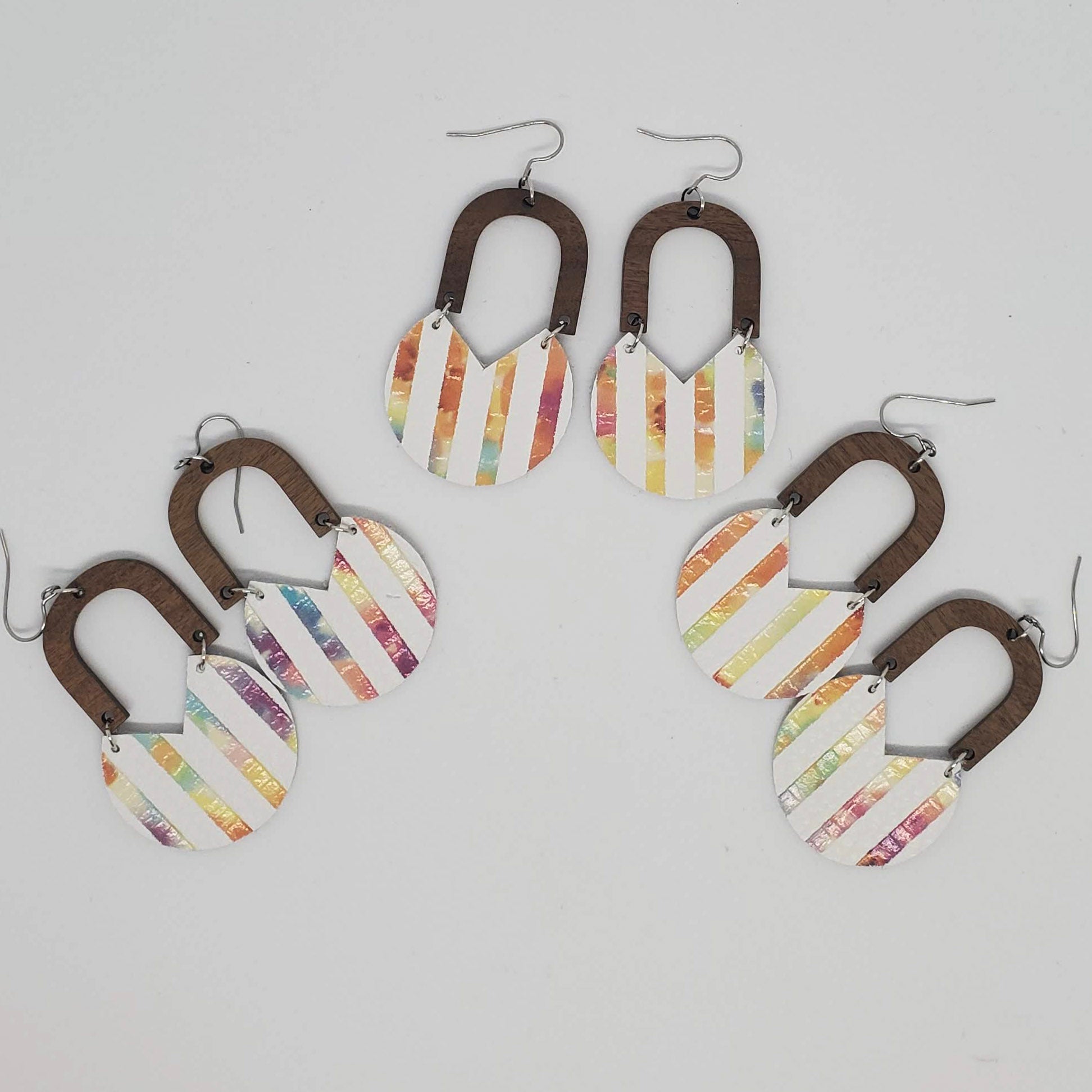 Geometric shapes in leather and metal or wood combine for a stunning on-trend look. Genuine leather (L) or leather backed cork (C) are accented with either non-tarnish, non-wear stainless steel or warm wood arches and finished with stainless steel ear wires. Measures approximately 2” from bottom of ear wire.