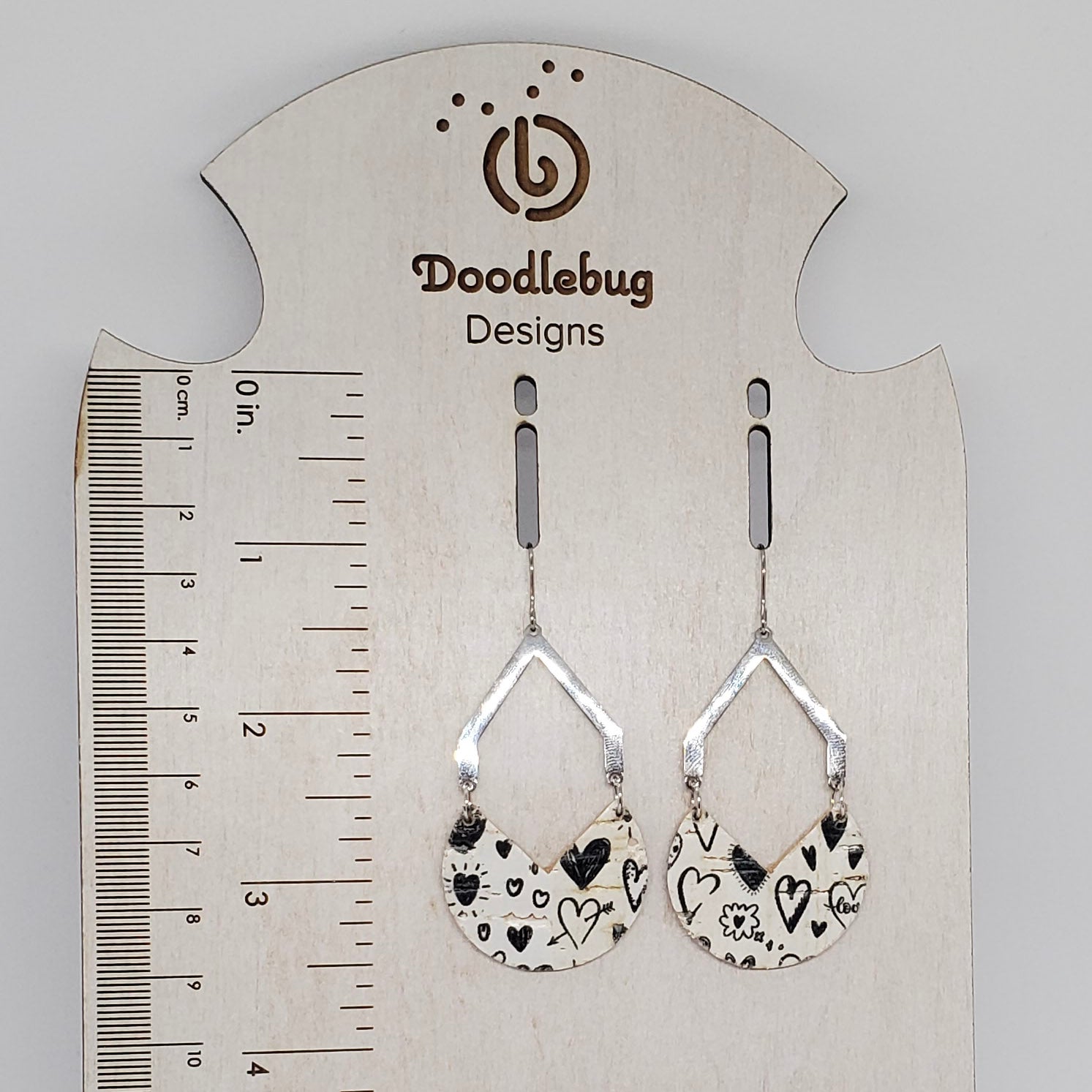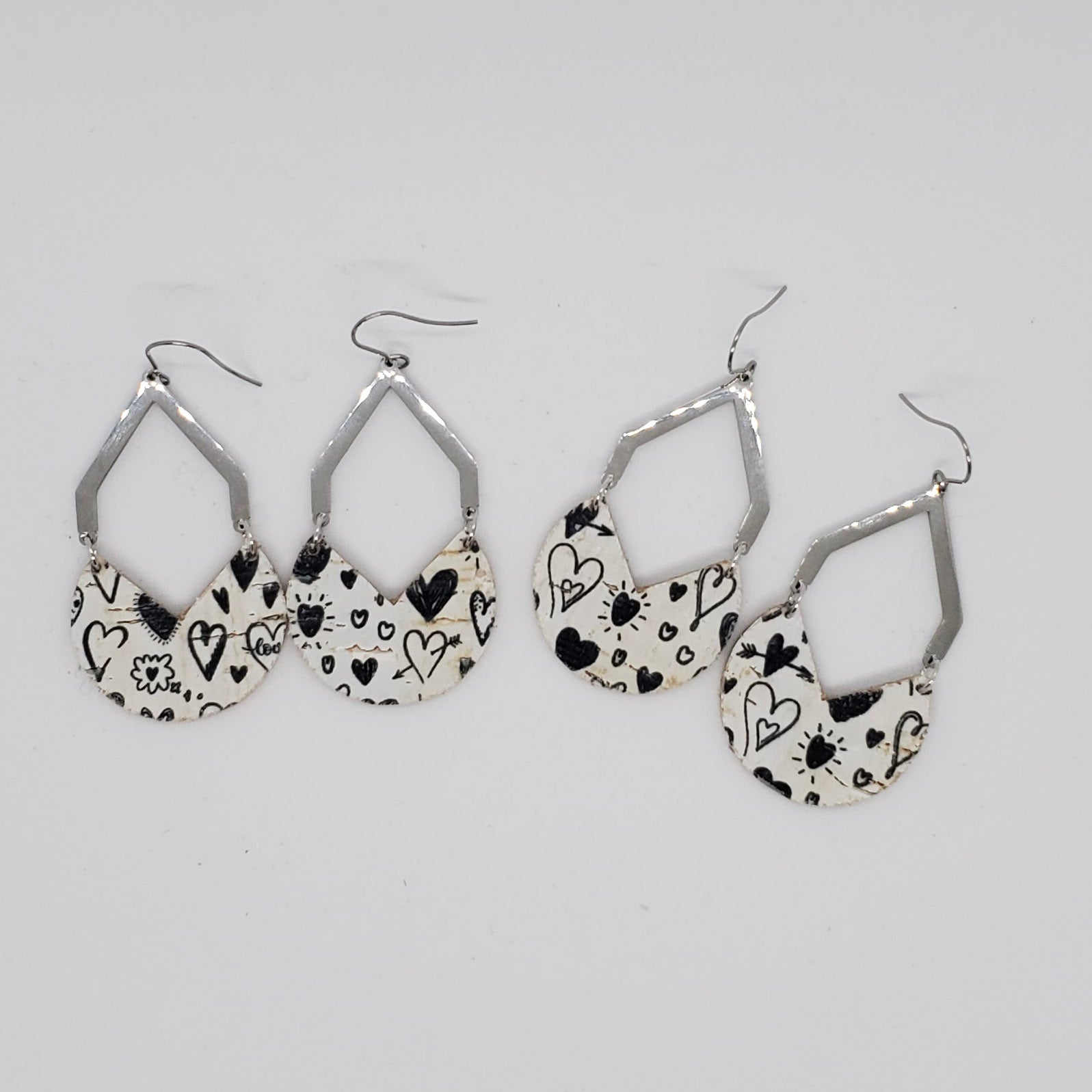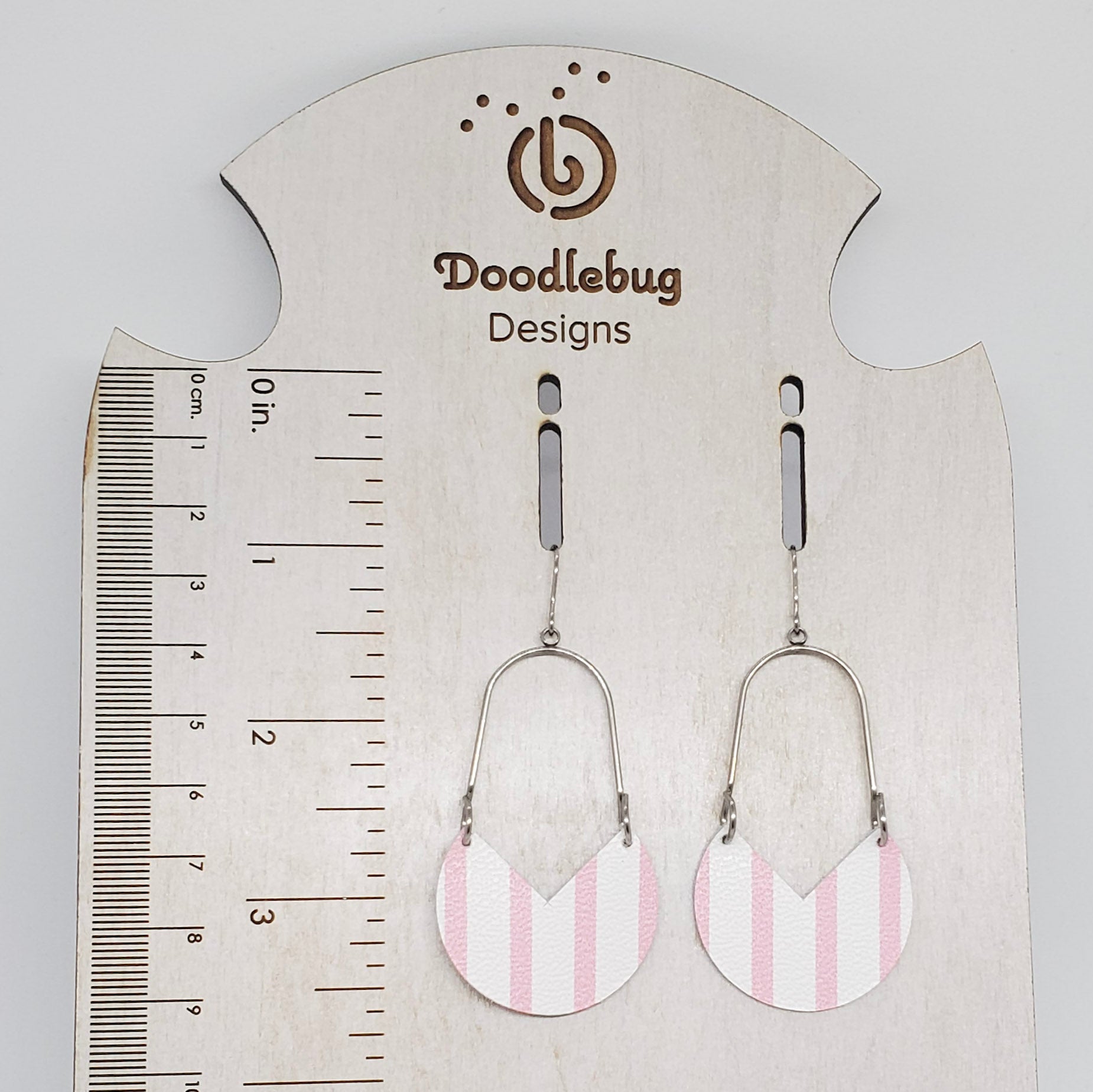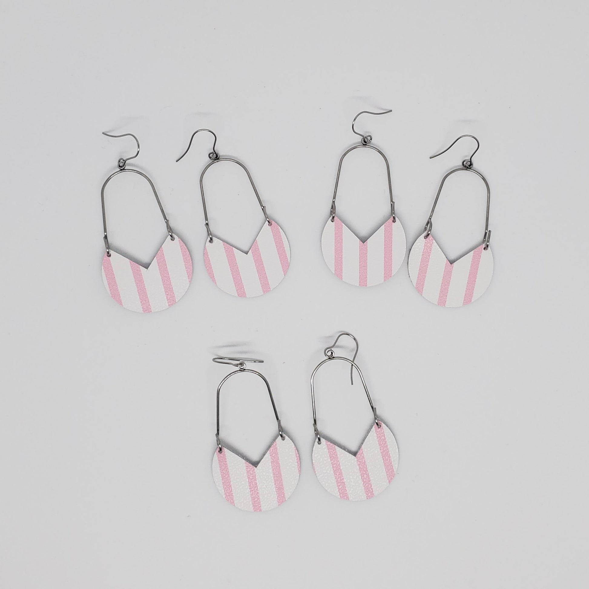 Geometric shapes in leather and metal or wood combine for a stunning on-trend look. Genuine leather (L) or leather backed cork (C) are accented with either non-tarnish, non-wear stainless steel or warm wood arches and finished with stainless steel ear wires. Measures approximately 2” from bottom of ear wire.