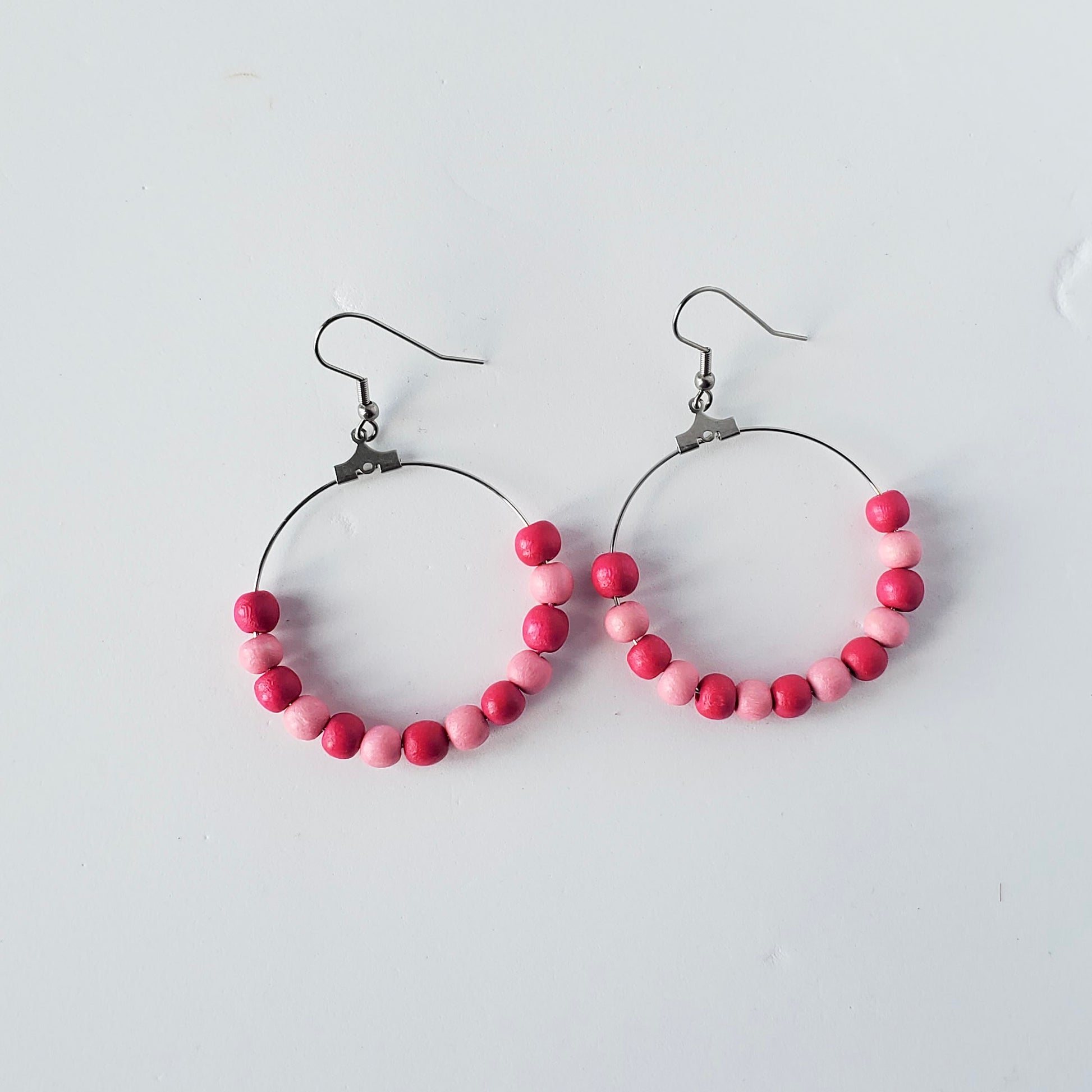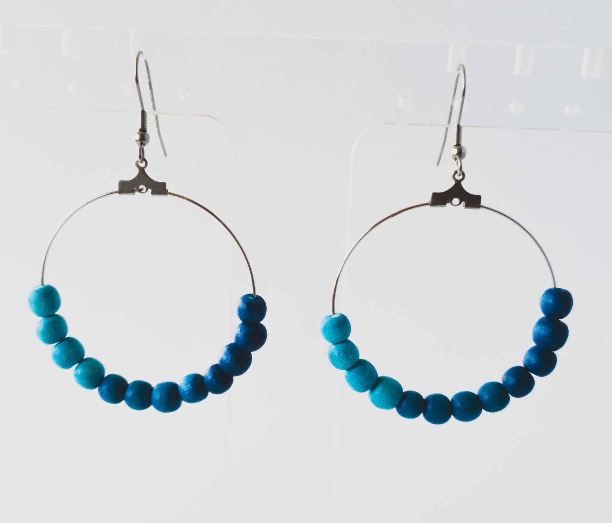 Stainless steel hoops (non-tarnish) are the base for gorgeous, lightweight wood beads. Round hoops measure 1.5”.
